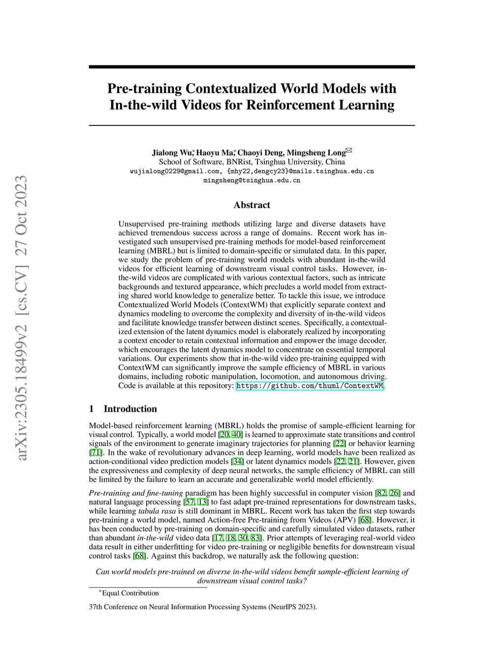 Unsupervised pre-training methods utilizing large and diverse datasets have achieved tremendous success across a range of domains. Recent work has investigated such unsupervised pre-training methods for model-based reinforcement learning (MBRL) but is limited to domain-specific or simulated data. In this paper, we study the problem of pre-training world models with abundant in-the-wild videos for efficient learning of downstream visual control tasks. However, in-the-wild videos are complicated with various contextual factors, such as intricate backgrounds and textured appearance, which precludes a world model from extracting shared world knowledge to generalize better. To tackle this issue, we introduce Contextualized World Models (ContextWM) that explicitly separate context and dynamics modeling to overcome the complexity and diversity of in-the-wild videos and facilitate knowledge transfer between distinct scenes. Specifically, a contextualized extension of the latent dynamics model is elaborately realized by incorporating a context encoder to retain contextual information and empower the image decoder, which encourages the latent dynamics model to concentrate on essential temporal variations. Our experiments show that in-the-wild video pre-training equipped with ContextWM can significantly improve the sample efficiency of MBRL in various domains, including robotic manipulation, locomotion, and autonomous driving. Code is available at this repository: https://github.com/thuml/ContextWM.