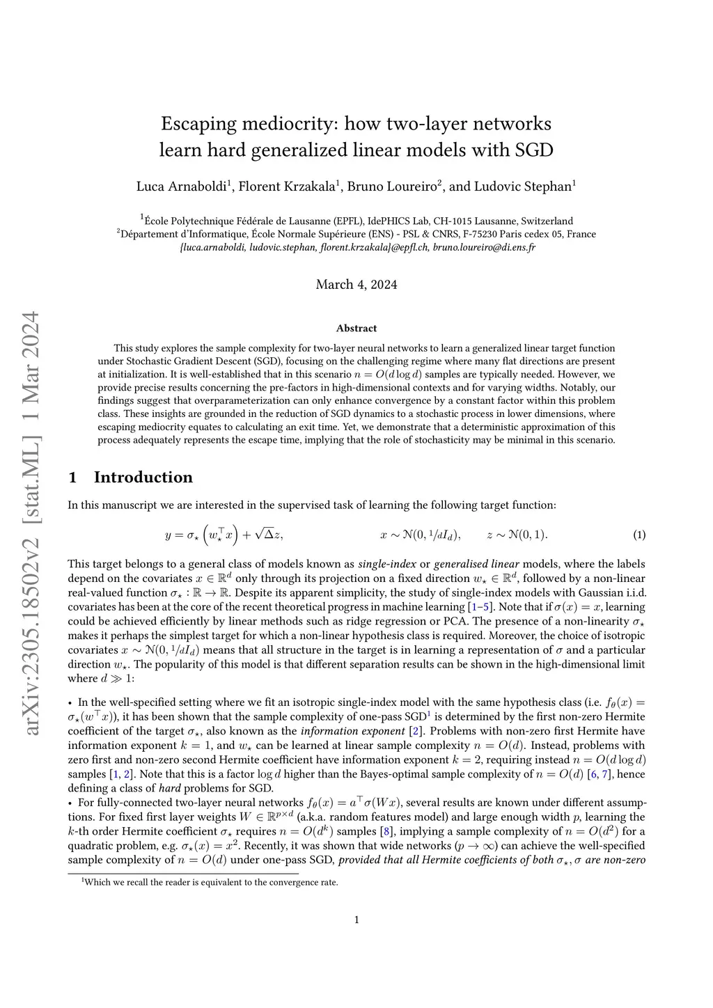 This study explores the sample complexity for two-layer neural networks to learn a generalized linear target function under Stochastic Gradient Descent (SGD), focusing on the challenging regime where many flat directions are present at initialization. It is well-established that in this scenario samples are typically needed. However, we provide precise results concerning the pre-factors in high-dimensional contexts and for varying widths. Notably, our findings suggest that overparameterization can only enhance convergence by a constant factor within this problem class. These insights are grounded in the reduction of SGD dynamics to a stochastic process in lower dimensions, where escaping mediocrity equates to calculating an exit time. Yet, we demonstrate that a deterministic approximation of this process adequately represents the escape time, implying that the role of stochasticity may be minimal in this scenario.
