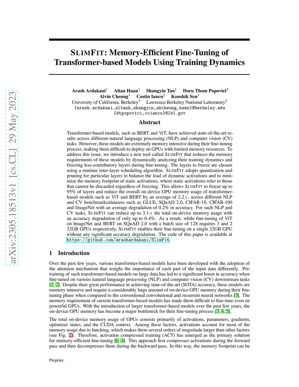 SlimFit: Memory-Efficient Fine-Tuning of Transformer-based Models Using