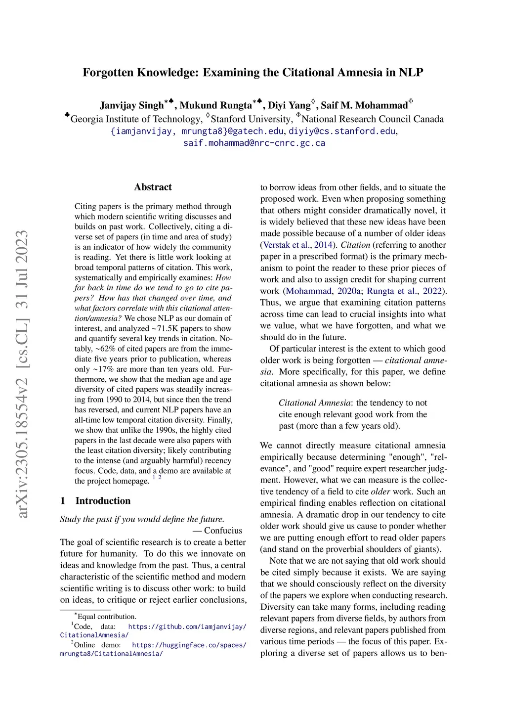 Citing papers is the primary method through which modern scientific writing discusses and builds on past work. Collectively, citing a diverse set of papers (in time and area of study) is an indicator of how widely the community is reading. Yet, there is little work looking at broad temporal patterns of citation. This work systematically and empirically examines: How far back in time do we tend to go to cite papers? How has that changed over time, and what factors correlate with this citational attention/amnesia? We chose NLP as our domain of interest and analyzed approximately 71.5K papers to show and quantify several key trends in citation. Notably, around 62% of cited papers are from the immediate five years prior to publication, whereas only about 17% are more than ten years old. Furthermore, we show that the median age and age diversity of cited papers were steadily increasing from 1990 to 2014, but since then, the trend has reversed, and current NLP papers have an all-time low temporal citation diversity. Finally, we show that unlike the 1990s, the highly cited papers in the last decade were also papers with the least citation diversity, likely contributing to the intense (and arguably harmful) recency focus. Code, data, and a demo are available on the project homepage.