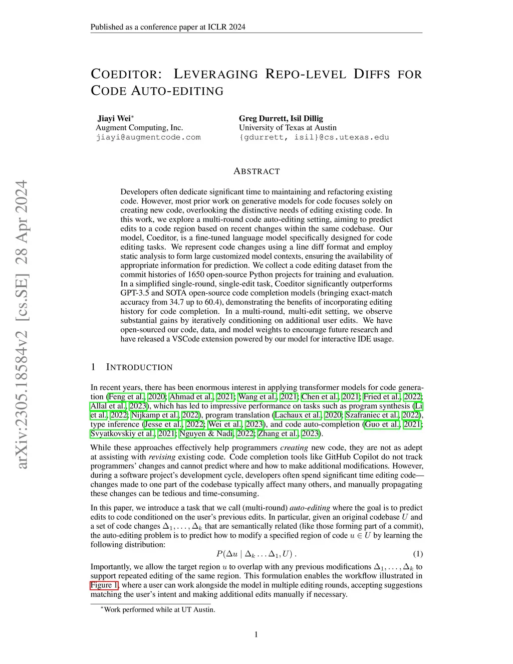 Developers often dedicate significant time to maintaining and refactoring existing code. However, most prior work on generative models for code focuses solely on creating new code, overlooking the distinctive needs of editing existing code. In this work, we explore a multi-round code auto-editing setting, aiming to predict edits to a code region based on recent changes within the same codebase. Our model, Coeditor, is a fine-tuned language model specifically designed for code editing tasks. We represent code changes using a line diff format and employ static analysis to form large customized model contexts, ensuring the availability of appropriate information for prediction. We collect a code editing dataset from the commit histories of 1650 open-source Python projects for training and evaluation. In a simplified single-round, single-edit task, Coeditor significantly outperforms GPT-3.5 and SOTA open-source code completion models (bringing exact-match accuracy from 34.7 up to 60.4), demonstrating the benefits of incorporating editing history for code completion. In a multi-round, multi-edit setting, we observe substantial gains by iteratively conditioning on additional user edits. We have open-sourced our code, data, and model weights to encourage future research and have released a VSCode extension powered by our model for interactive IDE usage.