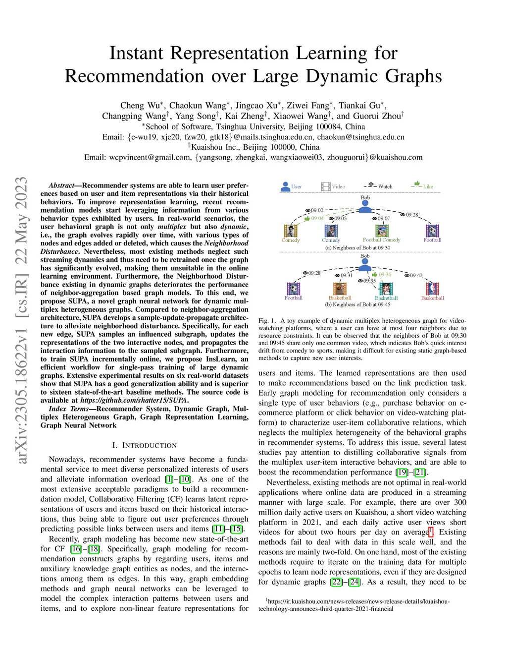 Recommender systems are able to learn user preferences based on user and item representations via their historical behaviors. To improve representation learning, recent recommendation models start leveraging information from various behavior types exhibited by users. In real-world scenarios, the user behavioral graph is not only multiplex but also dynamic, i.e., the graph evolves rapidly over time, with various types of nodes and edges added or deleted, which causes the Neighborhood Disturbance. Nevertheless, most existing methods neglect such streaming dynamics and thus need to be retrained once the graph has significantly evolved, making them unsuitable in the online learning environment. Furthermore, the Neighborhood Disturbance existing in dynamic graphs deteriorates the performance of neighbor-aggregation based graph models. To this end, we propose SUPA, a novel graph neural network for dynamic multiplex heterogeneous graphs. Compared to neighbor-aggregation architecture, SUPA develops a sample-update-propagate architecture to alleviate neighborhood disturbance. Specifically, for each new edge, SUPA samples an influenced subgraph, updates the representations of the two interactive nodes, and propagates the interaction information to the sampled subgraph. Furthermore, to train SUPA incrementally online, we propose InsLearn, an efficient workflow for single-pass training of large dynamic graphs. Extensive experimental results on six real-world datasets show that SUPA has a good generalization ability and is superior to sixteen state-of-the-art baseline methods. The source code is available at https://github.com/shatter15/SUPA.