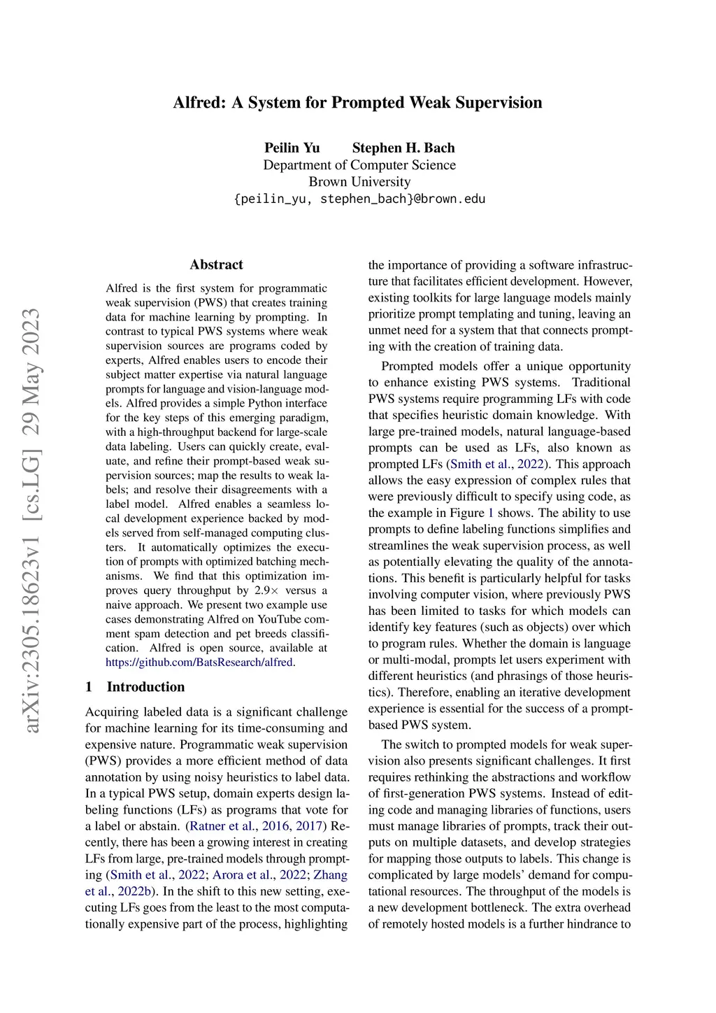 Alfred is the first system for programmatic weak supervision (PWS) that creates training data for machine learning by prompting. In contrast to typical PWS systems where weak supervision sources are programs coded by experts, Alfred enables users to encode their subject matter expertise via natural language prompts for language and vision-language models. Alfred provides a simple Python interface for the key steps of this emerging paradigm, with a high-throughput backend for large-scale data labeling. Users can quickly create, evaluate, and refine their prompt-based weak supervision sources; map the results to weak labels; and resolve their disagreements with a label model. Alfred enables a seamless local development experience backed by models served from self-managed computing clusters. It automatically optimizes the execution of prompts with optimized batching mechanisms. We find that this optimization improves query throughput by 2.9x versus a naive approach. We present two example use cases demonstrating Alfred on YouTube comment spam detection and pet breeds classification. Alfred is open source, available at https://github.com/BatsResearch/alfred.