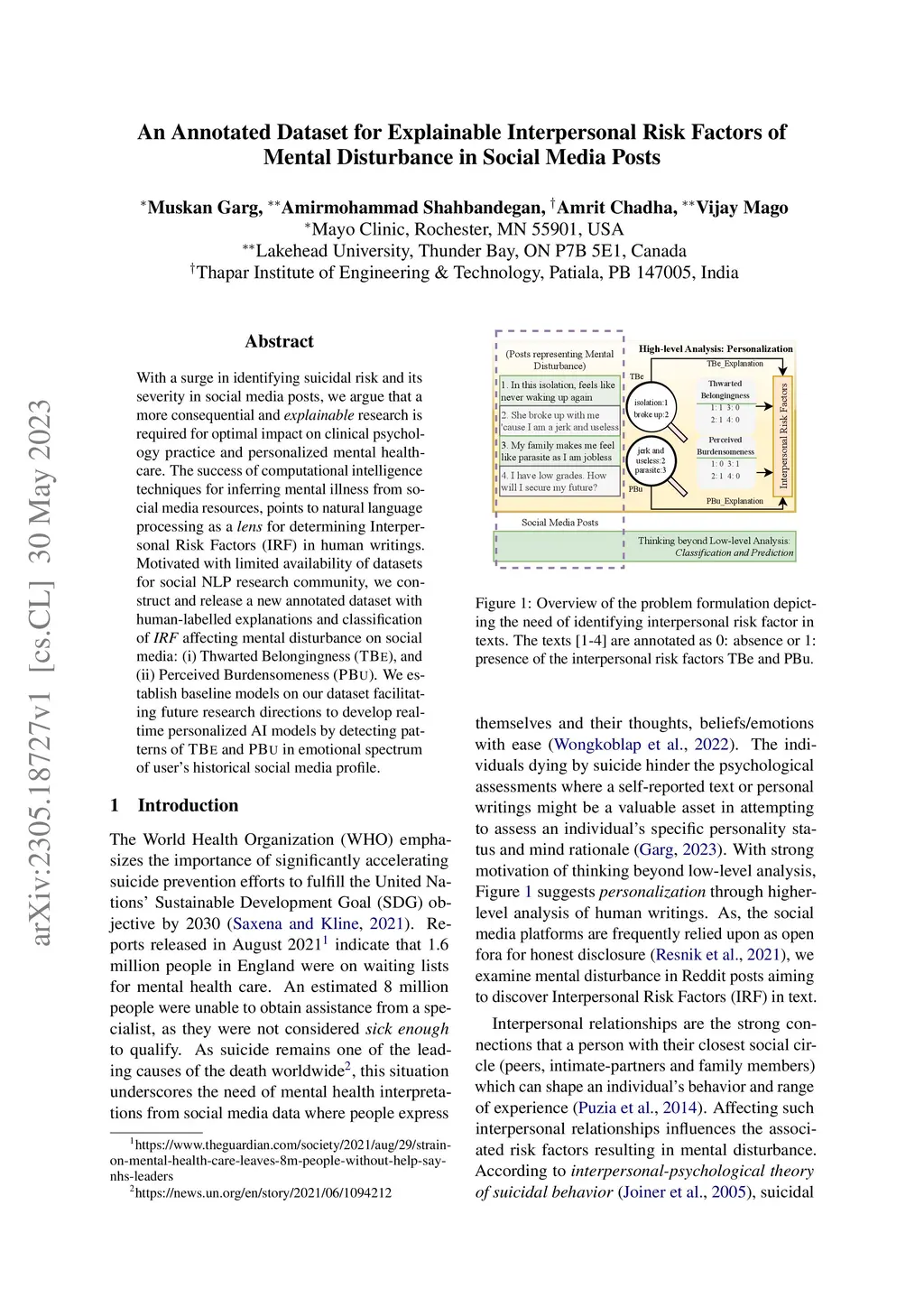 With a surge in identifying suicidal risk and its severity in social media posts, we argue that a more consequential and explainable research is required for optimal impact on clinical psychology practice and personalized mental healthcare. The success of computational intelligence techniques for inferring mental illness from social media resources, points to natural language processing as a lens for determining Interpersonal Risk Factors (IRF) in human writings. Motivated with limited availability of datasets for social NLP research community, we construct and release a new annotated dataset with human-labelled explanations and classification of IRF affecting mental disturbance on social media: (i) Thwarted Belongingness (TBe), and (ii) Perceived Burdensomeness (PBu). We establish baseline models on our dataset facilitating future research directions to develop real-time personalized AI models by detecting patterns of TBe and PBu in emotional spectrum of user's historical social media profile.