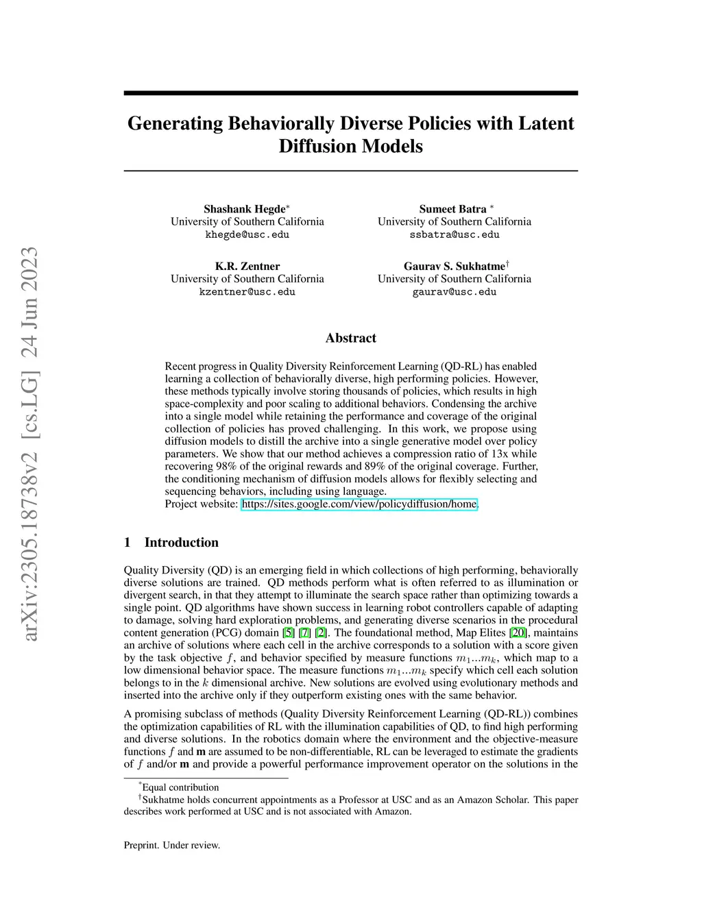 Recent progress in Quality Diversity Reinforcement Learning (QD-RL) has enabled learning a collection of behaviorally diverse, high performing policies. However, these methods typically involve storing thousands of policies, which results in high space-complexity and poor scaling to additional behaviors. Condensing the archive into a single model while retaining the performance and coverage of the original collection of policies has proved challenging. In this work, we propose using diffusion models to distill the archive into a single generative model over policy parameters. We show that our method achieves a compression ratio of 13x while recovering 98% of the original rewards and 89% of the original coverage. Further, the conditioning mechanism of diffusion models allows for flexibly selecting and sequencing behaviors, including using language. Project website: https://sites.google.com/view/policydiffusion/home