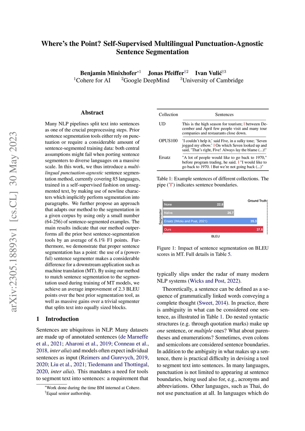 Many NLP pipelines split text into sentences as one of the crucial preprocessing steps. Prior sentence segmentation tools either rely on punctuation or require a considerable amount of sentence-segmented training data: both central assumptions might fail when porting sentence segmenters to diverse languages on a massive scale. In this work, we thus introduce a multilingual punctuation-agnostic sentence segmentation method, currently covering 85 languages, trained in a self-supervised fashion on unsegmented text, by making use of newline characters which implicitly perform segmentation into paragraphs. We further propose an approach that adapts our method to the segmentation in a given corpus by using only a small number (64-256) of sentence-segmented examples. The main results indicate that our method outperforms all the prior best sentence-segmentation tools by an average of 6.1% F1 points. Furthermore, we demonstrate that proper sentence segmentation has a point: the use of a (powerful) sentence segmenter makes a considerable difference for a downstream application such as machine translation (MT). By using our method to match sentence segmentation to the segmentation used during training of MT models, we achieve an average improvement of 2.3 BLEU points over the best prior segmentation tool, as well as massive gains over a trivial segmenter that splits text into equally sized blocks.