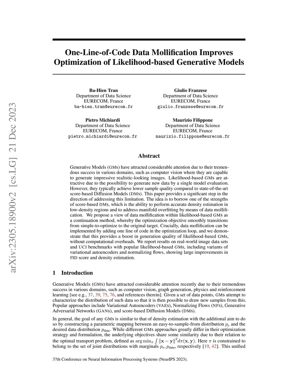 Generative Models (GMs) have attracted considerable attention due to their tremendous success in various domains, such as computer vision where they are capable to generate impressive realistic-looking images. Likelihood-based GMs are attractive due to the possibility to generate new data by a single model evaluation. However, they typically achieve lower sample quality compared to state-of-the-art score-based diffusion models (DMs). This paper provides a significant step in the direction of addressing this limitation. The idea is to borrow one of the strengths of score-based DMs, which is the ability to perform accurate density estimation in low-density regions and to address manifold overfitting by means of data mollification. We connect data mollification through the addition of Gaussian noise to Gaussian homotopy, which is a well-known technique to improve optimization. Data mollification can be implemented by adding one line of code in the optimization loop, and we demonstrate that this provides a boost in generation quality of likelihood-based GMs, without computational overheads. We report results on image data sets with popular likelihood-based GMs, including variants of variational autoencoders and normalizing flows, showing large improvements in FID score.