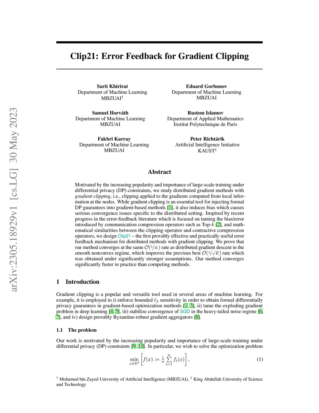 Motivated by the increasing popularity and importance of large-scale training under differential privacy (DP) constraints, we study distributed gradient methods with gradient clipping, i.e., clipping applied to the gradients computed from local information at the nodes. While gradient clipping is an essential tool for injecting formal DP guarantees into gradient-based methods [1], it also induces bias which causes serious convergence issues specific to the distributed setting. Inspired by recent progress in the error-feedback literature which is focused on taming the bias/error introduced by communication compression operators such as Top- [2], and mathematical similarities between the clipping operator and contractive compression operators, we design Clip21 -- the first provably effective and practically useful error feedback mechanism for distributed methods with gradient clipping. We prove that our method converges at the same rate as distributed gradient descent in the smooth nonconvex regime, which improves the previous best rate which was obtained under significantly stronger assumptions. Our method converges significantly faster in practice than competing methods.