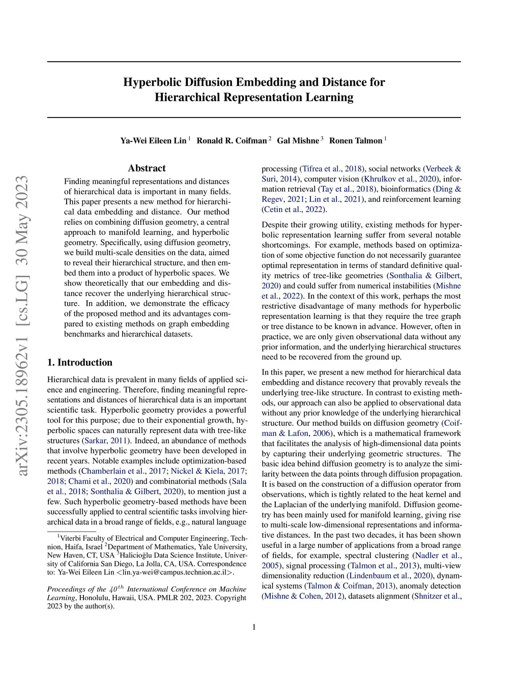 Finding meaningful representations and distances of hierarchical data is important in many fields. This paper presents a new method for hierarchical data embedding and distance. Our method relies on combining diffusion geometry, a central approach to manifold learning, and hyperbolic geometry. Specifically, using diffusion geometry, we build multi-scale densities on the data, aimed to reveal their hierarchical structure, and then embed them into a product of hyperbolic spaces. We show theoretically that our embedding and distance recover the underlying hierarchical structure. In addition, we demonstrate the efficacy of the proposed method and its advantages compared to existing methods on graph embedding benchmarks and hierarchical datasets.