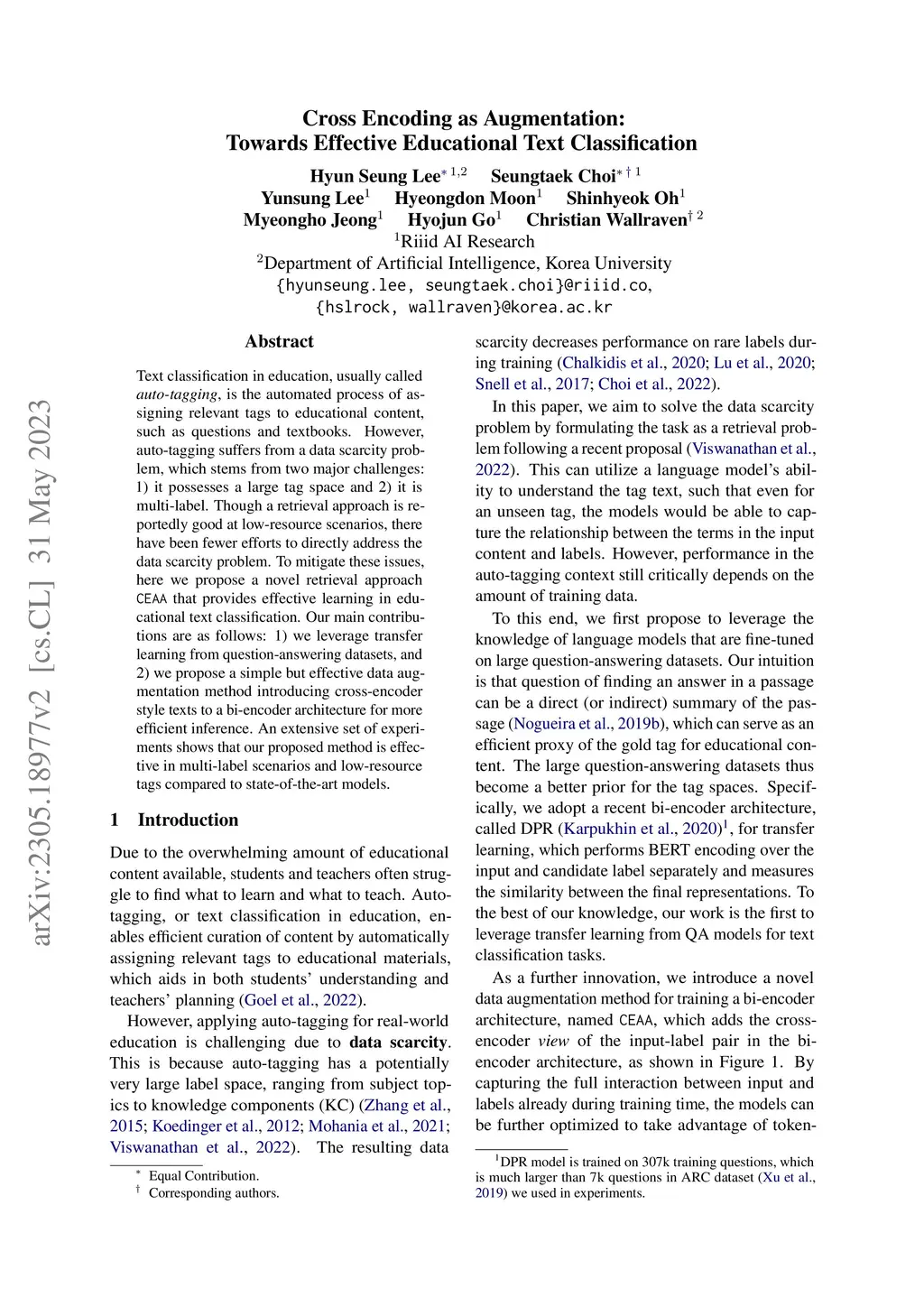 Text classification in education, usually called auto-tagging, is the automated process of assigning relevant tags to educational content, such as questions and textbooks. However, auto-tagging suffers from a data scarcity problem, which stems from two major challenges: 1) it possesses a large tag space and 2) it is multi-label. Though a retrieval approach is reportedly good at low-resource scenarios, there have been fewer efforts to directly address the data scarcity problem. To mitigate these issues, here we propose a novel retrieval approach CEAA that provides effective learning in educational text classification. Our main contributions are as follows: 1) we leverage transfer learning from question-answering datasets, and 2) we propose a simple but effective data augmentation method introducing cross-encoder style texts to a bi-encoder architecture for more efficient inference. An extensive set of experiments shows that our proposed method is effective in multi-label scenarios and low-resource tags compared to state-of-the-art models.