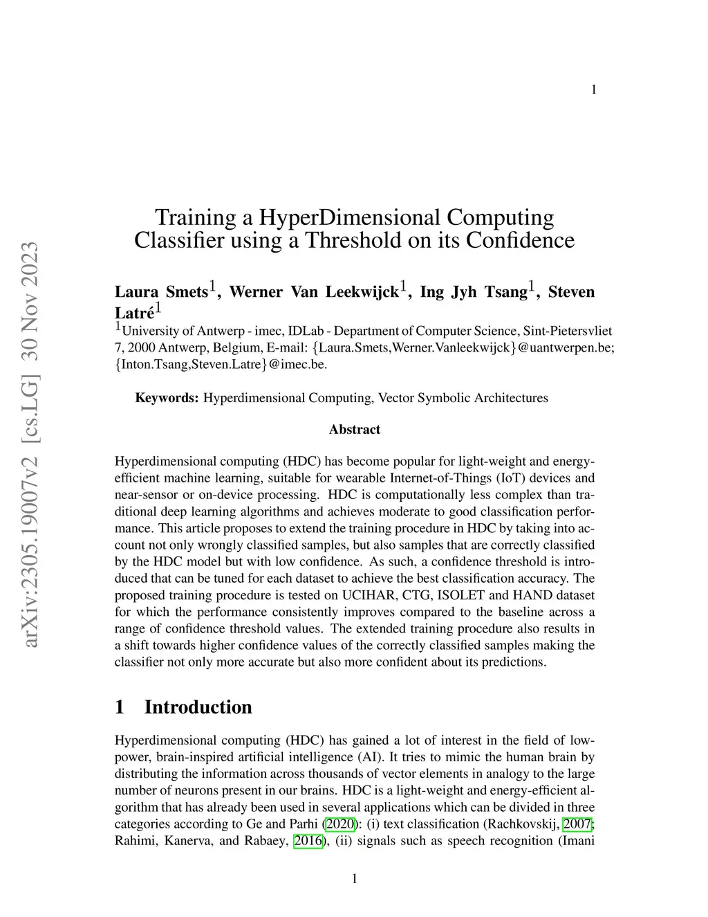 Hyperdimensional computing (HDC) has become popular for light-weight and energy-efficient machine learning, suitable for wearable Internet-of-Things (IoT) devices and near-sensor or on-device processing. HDC is computationally less complex than traditional deep learning algorithms and achieves moderate to good classification performance. This article proposes to extend the training procedure in HDC by taking into account not only wrongly classified samples, but also samples that are correctly classified by the HDC model but with low confidence. As such, a confidence threshold is introduced that can be tuned for each dataset to achieve the best classification accuracy. The proposed training procedure is tested on UCIHAR, CTG, ISOLET and HAND dataset for which the performance consistently improves compared to the baseline across a range of confidence threshold values. The extended training procedure also results in a shift towards higher confidence values of the correctly classified samples making the classifier not only more accurate but also more confident about its predictions.