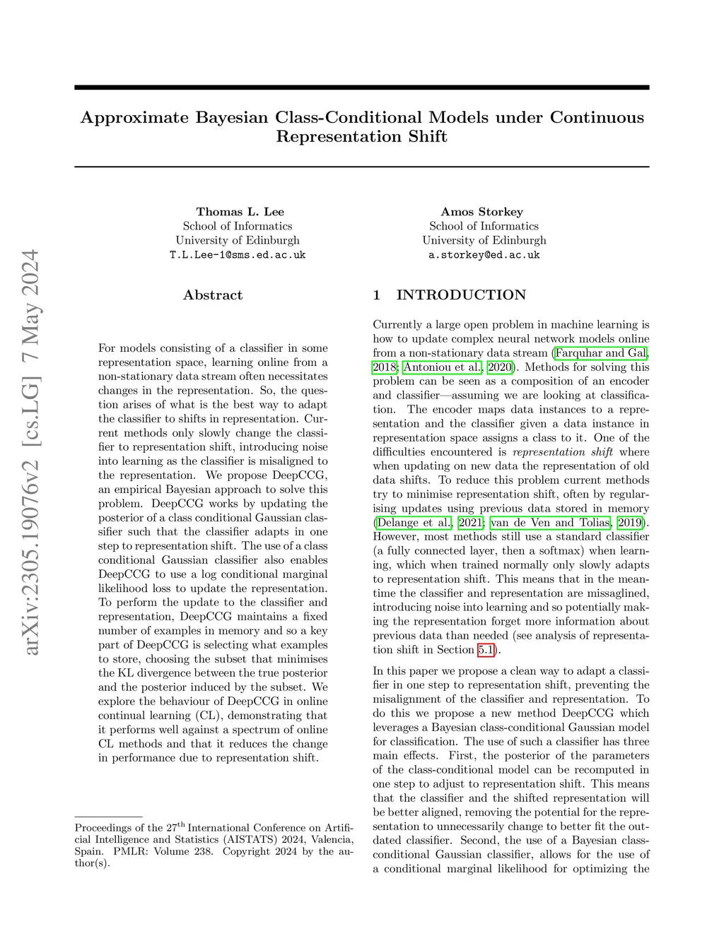For models consisting of a classifier in some representation space, learning online from a non-stationary data stream often necessitates changes in the representation. So, the question arises of what is the best way to adapt the classifier to shifts in representation. Current methods only slowly change the classifier to representation shift, introducing noise into learning as the classifier is misaligned to the representation. We propose DeepCCG, an empirical Bayesian approach to solve this problem. DeepCCG works by updating the posterior of a class conditional Gaussian classifier such that the classifier adapts in one step to representation shift. The use of a class conditional Gaussian classifier also enables DeepCCG to use a log conditional marginal likelihood loss to update the representation. To perform the update to the classifier and representation, DeepCCG maintains a fixed number of examples in memory and so a key part of DeepCCG is selecting what examples to store, choosing the subset that minimises the KL divergence between the true posterior and the posterior induced by the subset. We explore the behaviour of DeepCCG in online continual learning (CL), demonstrating that it performs well against a spectrum of online CL methods and that it reduces the change in performance due to representation shift.