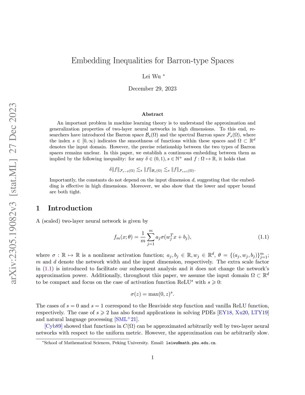 One of the fundamental problems in deep learning theory is understanding the approximation and generalization properties of two-layer neural networks in high dimensions. In order to tackle this issue, researchers have introduced the Barron space and the spectral Barron space , where the index characterizes the smoothness of functions within these spaces and represents the input domain. However, it is still not clear what is the relationship between the two types of Barron spaces. In this paper, we establish continuous embeddings between these spaces as implied by the following inequality: for any and , it holds that \[ \delta\gamma^{\delta-s}_{\Omega}\|f\|_{\mathcal{F}_{s-\delta}(\Omega)}\lesssim_s \|f\|_{\mathcal{B}_s(\Omega)}\lesssim_s \|f\|_{\mathcal{F}_{s+1}(\Omega)}, \] where and notably, the hidden constants depend solely on the value of . Furthermore, we provide examples to demonstrate that the lower bound is tight.