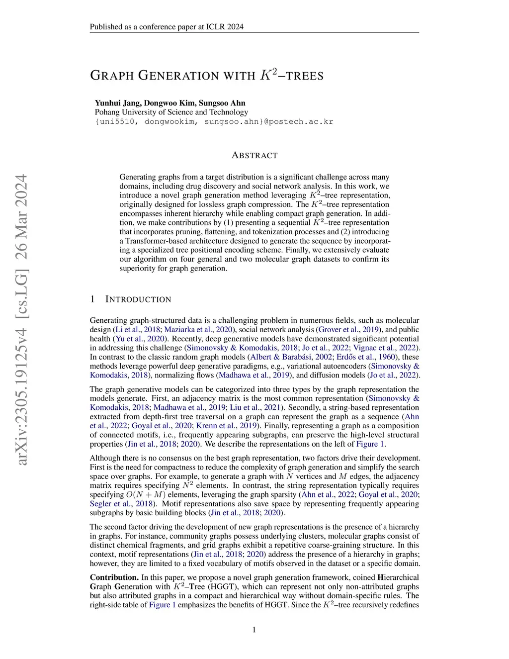 Generating graphs from a target distribution is a significant challenge across many domains, including drug discovery and social network analysis. In this work, we introduce a novel graph generation method leveraging -tree representation, originally designed for lossless graph compression. The -tree representation {encompasses inherent hierarchy while enabling compact graph generation}. In addition, we make contributions by (1) presenting a sequential -treerepresentation that incorporates pruning, flattening, and tokenization processes and (2) introducing a Transformer-based architecture designed to generate the sequence by incorporating a specialized tree positional encoding scheme. Finally, we extensively evaluate our algorithm on four general and two molecular graph datasets to confirm its superiority for graph generation.