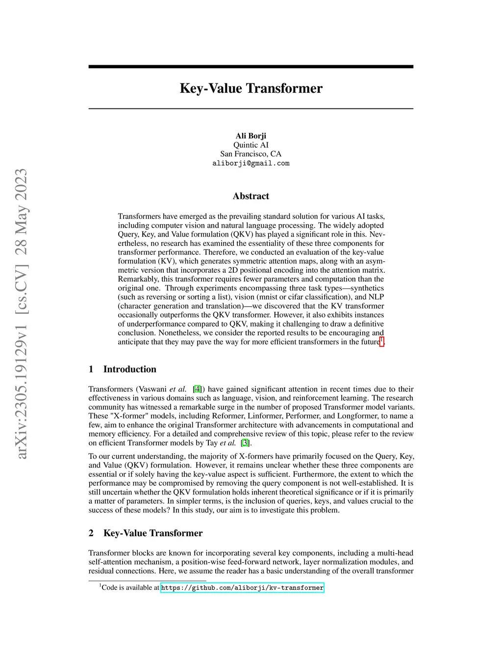 Transformers have emerged as the prevailing standard solution for various AI tasks, including computer vision and natural language processing. The widely adopted Query, Key, and Value formulation (QKV) has played a significant role in this. Nevertheless, no research has examined the essentiality of these three components for transformer performance. Therefore, we conducted an evaluation of the key-value formulation (KV), which generates symmetric attention maps, along with an asymmetric version that incorporates a 2D positional encoding into the attention matrix. Remarkably, this transformer requires fewer parameters and computation than the original one. Through experiments encompassing three task types -- synthetics (such as reversing or sorting a list), vision (mnist or cifar classification), and NLP (character generation and translation) -- we discovered that the KV transformer occasionally outperforms the QKV transformer. However, it also exhibits instances of underperformance compared to QKV, making it challenging to draw a definitive conclusion. Nonetheless, we consider the reported results to be encouraging and anticipate that they may pave the way for more efficient transformers in the future.