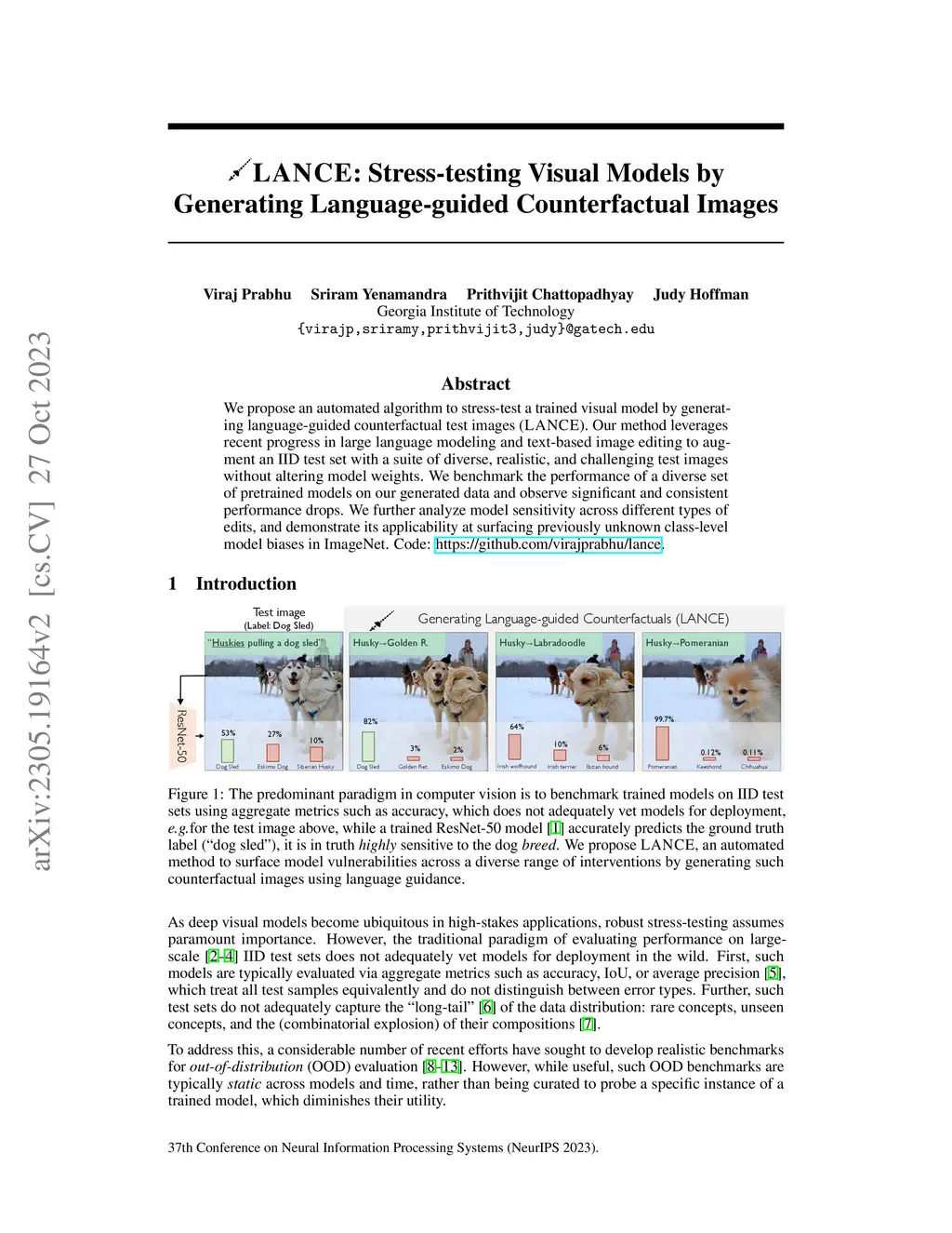 We propose an automated algorithm to stress-test a trained visual model by generating language-guided counterfactual test images (LANCE). Our method leverages recent progress in large language modeling and text-based image editing to augment an IID test set with a suite of diverse, realistic, and challenging test images without altering model weights. We benchmark the performance of a diverse set of pre-trained models on our generated data and observe significant and consistent performance drops. We further analyze model sensitivity across different types of edits, and demonstrate its applicability at surfacing previously unknown class-level model biases in ImageNet. Code is available at https://github.com/virajprabhu/lance.