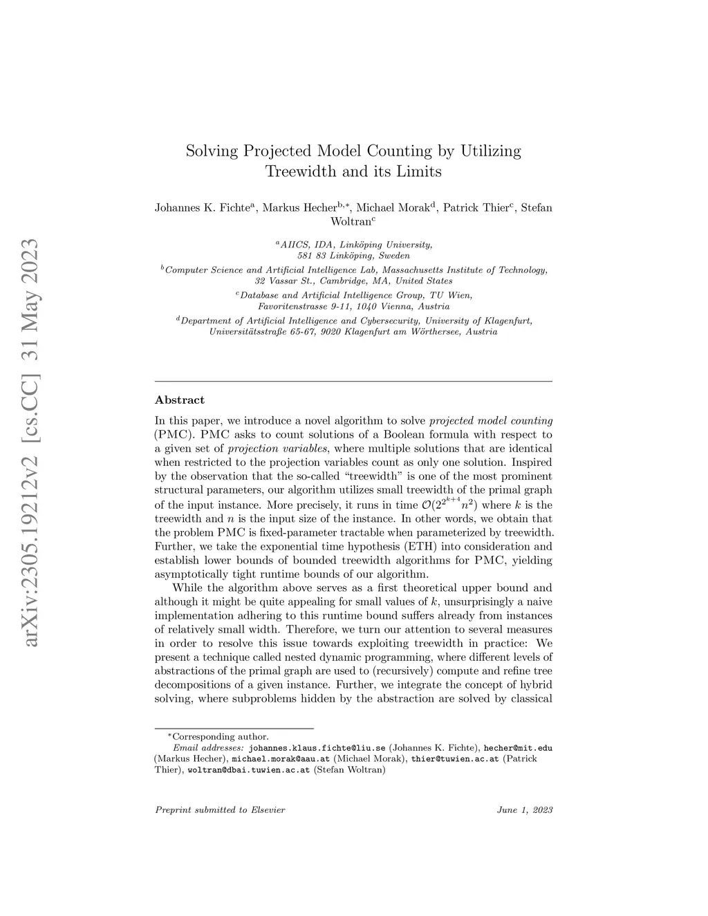 In this paper, we introduce a novel algorithm to solve projected model counting (PMC). PMC asks to count solutions of a Boolean formula with respect to a given set of projection variables, where multiple solutions that are identical when restricted to the projection variables count as only one solution. Inspired by the observation that the so-called "treewidth" is one of the most prominent structural parameters, our algorithm utilizes small treewidth of the primal graph of the input instance. More precisely, it runs in time O(2^2k+4n2) where k is the treewidth and n is the input size of the instance. In other words, we obtain that the problem PMC is fixed-parameter tractable when parameterized by treewidth. Further, we take the exponential time hypothesis (ETH) into consideration and establish lower bounds of bounded treewidth algorithms for PMC, yielding asymptotically tight runtime bounds of our algorithm. While the algorithm above serves as a first theoretical upper bound and although it might be quite appealing for small values of k, unsurprisingly a naive implementation adhering to this runtime bound suffers already from instances of relatively small width. Therefore, we turn our attention to several measures in order to resolve this issue towards exploiting treewidth in practice: We present a technique called nested dynamic programming, where different levels of abstractions of the primal graph are used to (recursively) compute and refine tree decompositions of a given instance. Finally, we provide a nested dynamic programming algorithm and an implementation that relies on database technology for PMC and a prominent special case of PMC, namely model counting (#Sat). Experiments indicate that the advancements are promising, allowing us to solve instances of treewidth upper bounds beyond 200.