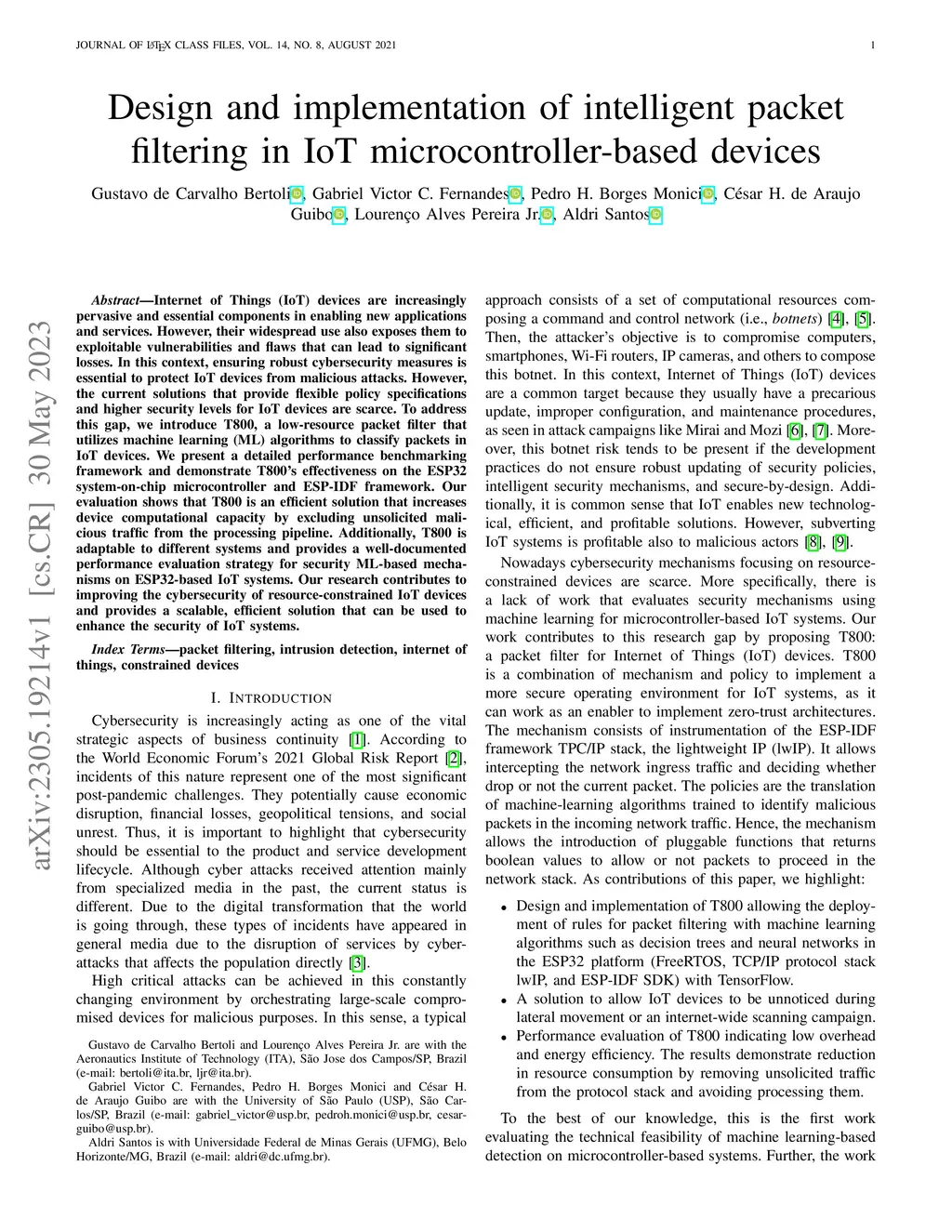 Internet of Things (IoT) devices are increasingly pervasive and essential components in enabling new applications and services. However, their widespread use also exposes them to exploitable vulnerabilities and flaws that can lead to significant losses. In this context, ensuring robust cybersecurity measures is essential to protect IoT devices from malicious attacks. However, the current solutions that provide flexible policy specifications and higher security levels for IoT devices are scarce. To address this gap, we introduce T800, a low-resource packet filter that utilizes machine learning (ML) algorithms to classify packets in IoT devices. We present a detailed performance benchmarking framework and demonstrate T800's effectiveness on the ESP32 system-on-chip microcontroller and ESP-IDF framework. Our evaluation shows that T800 is an efficient solution that increases device computational capacity by excluding unsolicited malicious traffic from the processing pipeline. Additionally, T800 is adaptable to different systems and provides a well-documented performance evaluation strategy for security ML-based mechanisms on ESP32-based IoT systems. Our research contributes to improving the cybersecurity of resource-constrained IoT devices and provides a scalable, efficient solution that can be used to enhance the security of IoT systems.