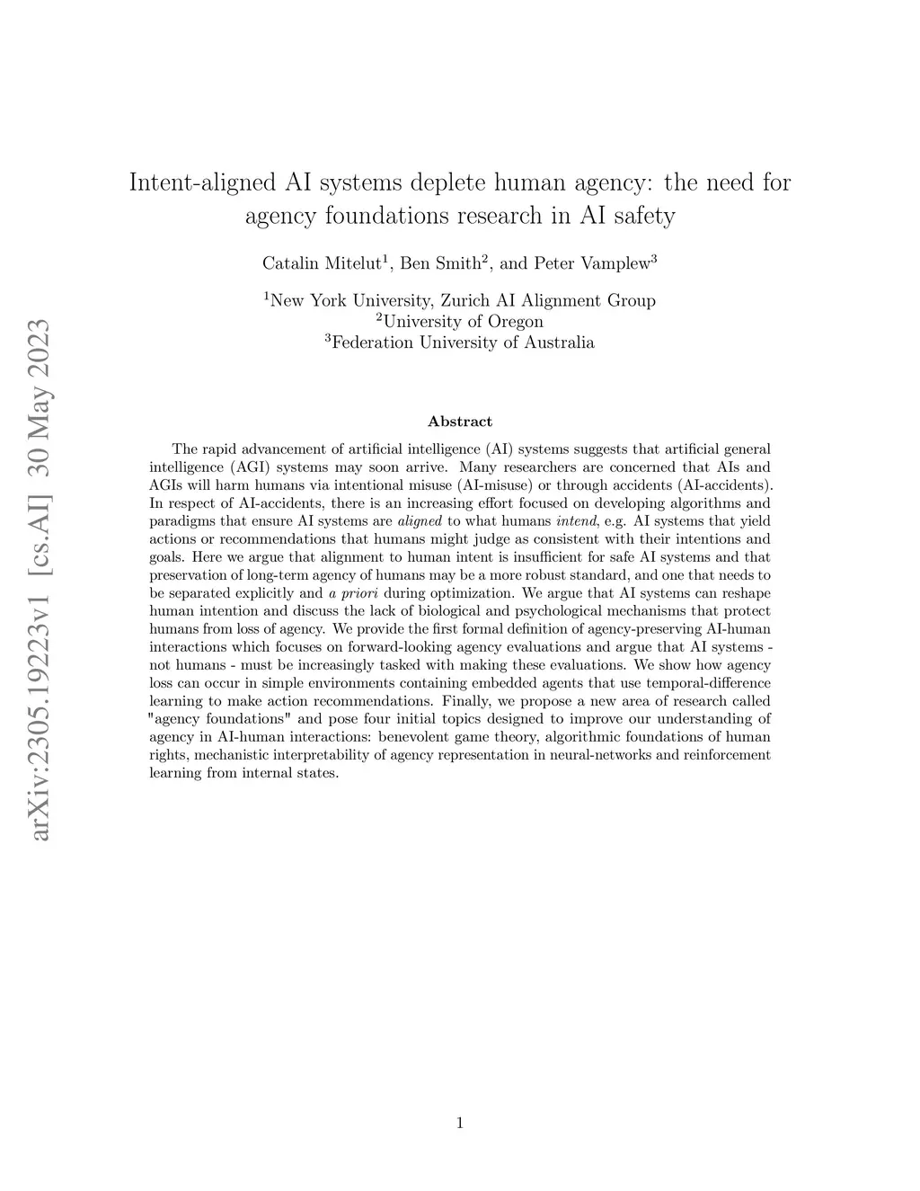 The rapid advancement of artificial intelligence (AI) systems suggests that artificial general intelligence (AGI) systems may soon arrive. Many researchers are concerned that AIs and AGIs will harm humans via intentional misuse (AI-misuse) or through accidents (AI-accidents). In respect of AI-accidents, there is an increasing effort focused on developing algorithms and paradigms that ensure AI systems are aligned to what humans intend, e.g. AI systems that yield actions or recommendations that humans might judge as consistent with their intentions and goals. Here we argue that alignment to human intent is insufficient for safe AI systems and that preservation of long-term agency of humans may be a more robust standard, and one that needs to be separated explicitly and a priori during optimization. We argue that AI systems can reshape human intention and discuss the lack of biological and psychological mechanisms that protect humans from loss of agency. We provide the first formal definition of agency-preserving AI-human interactions which focuses on forward-looking agency evaluations and argue that AI systems - not humans - must be increasingly tasked with making these evaluations. We show how agency loss can occur in simple environments containing embedded agents that use temporal-difference learning to make action recommendations. Finally, we propose a new area of research called "agency foundations" and pose four initial topics designed to improve our understanding of agency in AI-human interactions: benevolent game theory, algorithmic foundations of human rights, mechanistic interpretability of agency representation in neural-networks and reinforcement learning from internal states.