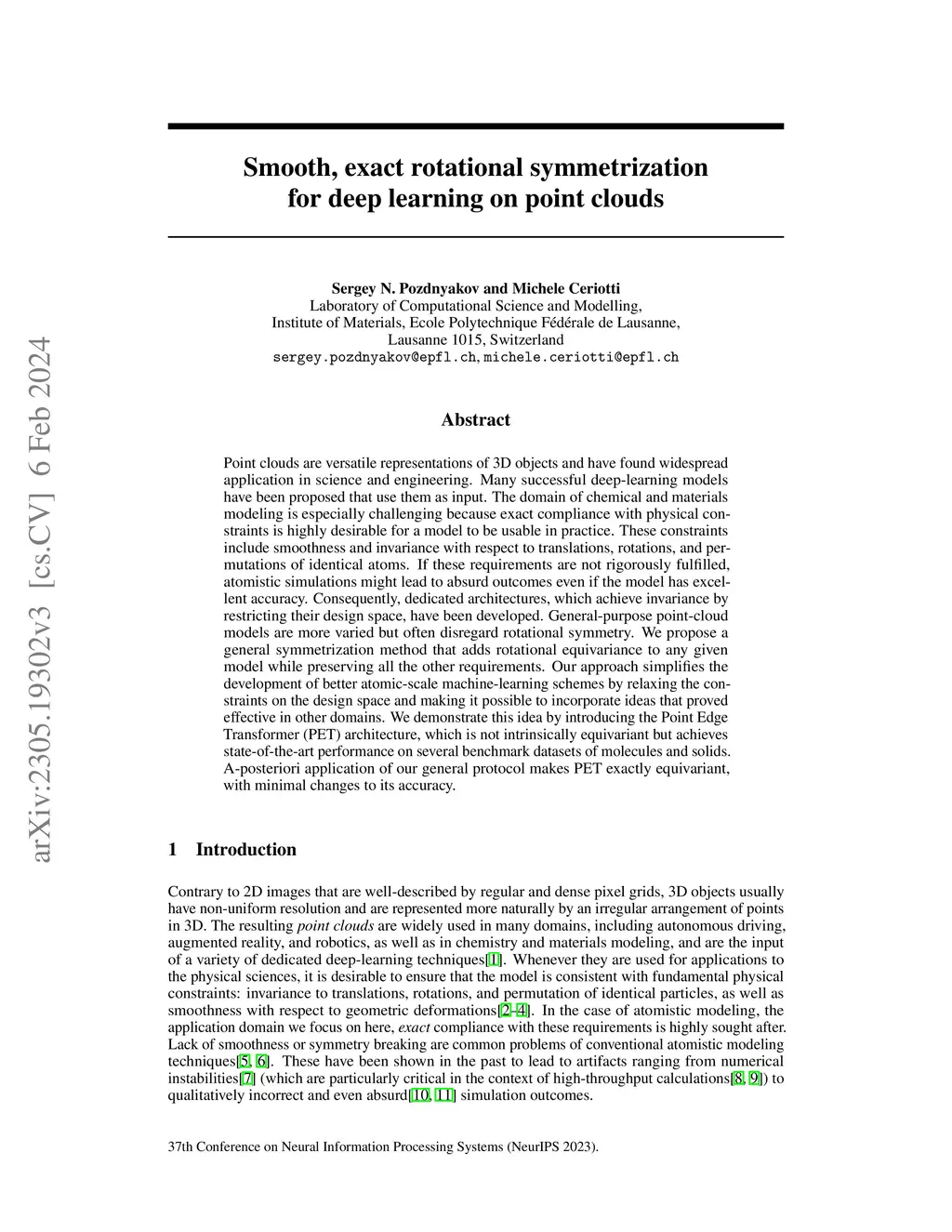 Point clouds are versatile representations of 3D objects and have found widespread application in science and engineering. Many successful deep-learning models have been proposed that use them as input. The domain of chemical and materials modeling is especially challenging because exact compliance with physical constraints is highly desirable for a model to be usable in practice. These constraints include smoothness and invariance with respect to translations, rotations, and permutations of identical atoms. If these requirements are not rigorously fulfilled, atomistic simulations might lead to absurd outcomes even if the model has excellent accuracy. Consequently, dedicated architectures, which achieve invariance by restricting their design space, have been developed. General-purpose point-cloud models are more varied but often disregard rotational symmetry. We propose a general symmetrization method that adds rotational equivariance to any given model while preserving all the other requirements. Our approach simplifies the development of better atomic-scale machine-learning schemes by relaxing the constraints on the design space and making it possible to incorporate ideas that proved effective in other domains. We demonstrate this idea by introducing the Point Edge Transformer (PET) architecture, which is not intrinsically equivariant but achieves state-of-the-art performance on several benchmark datasets of molecules and solids. A-posteriori application of our general protocol makes PET exactly equivariant, with minimal changes to its accuracy.
