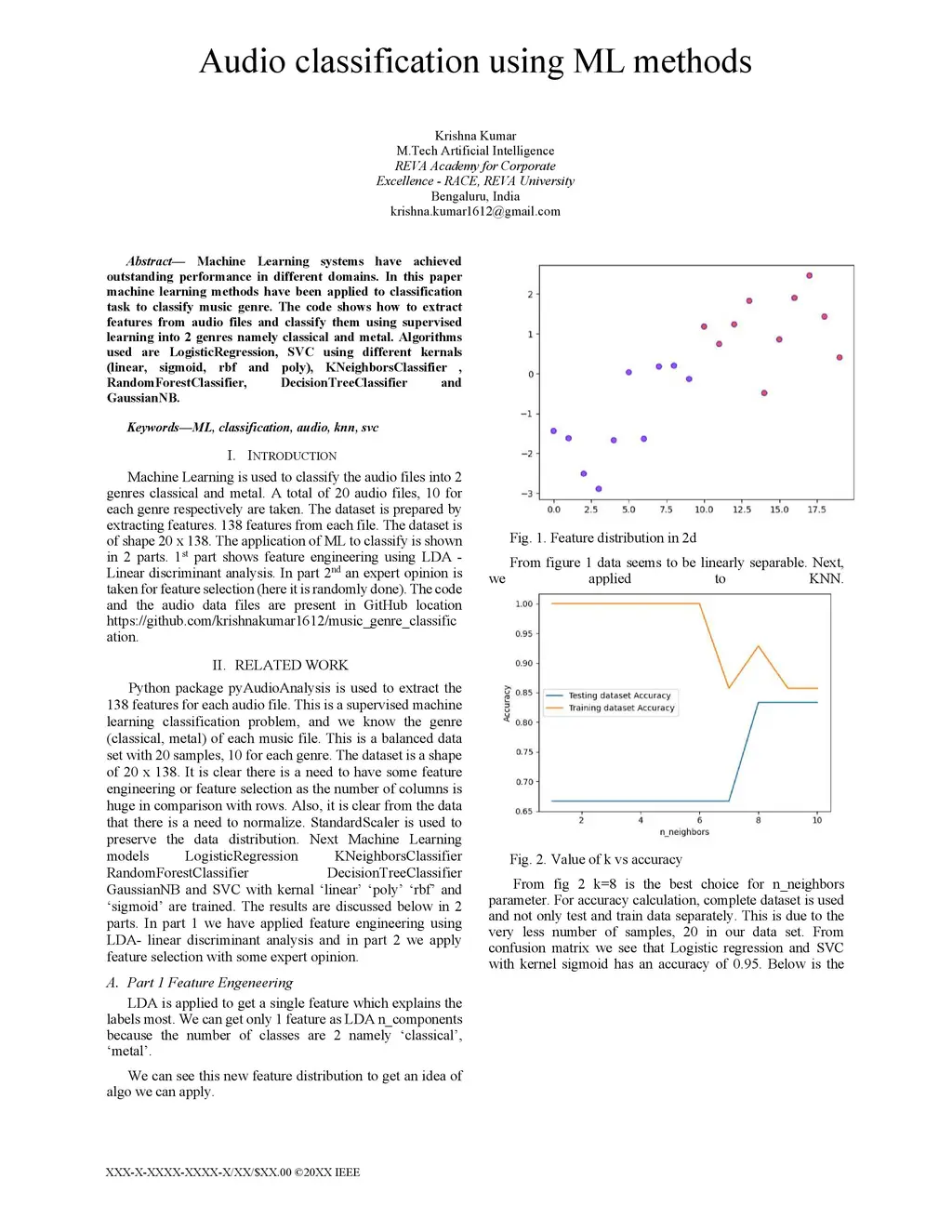 Machine Learning systems have achieved outstanding performance in different domains. In this paper machine learning methods have been applied to classification task to classify music genre. The code shows how to extract features from audio files and classify them using supervised learning into 2 genres namely classical and metal. Algorithms used are LogisticRegression, SVC using different kernals (linear, sigmoid, rbf and poly), KNeighborsClassifier , RandomForestClassifier, DecisionTreeClassifier and GaussianNB.