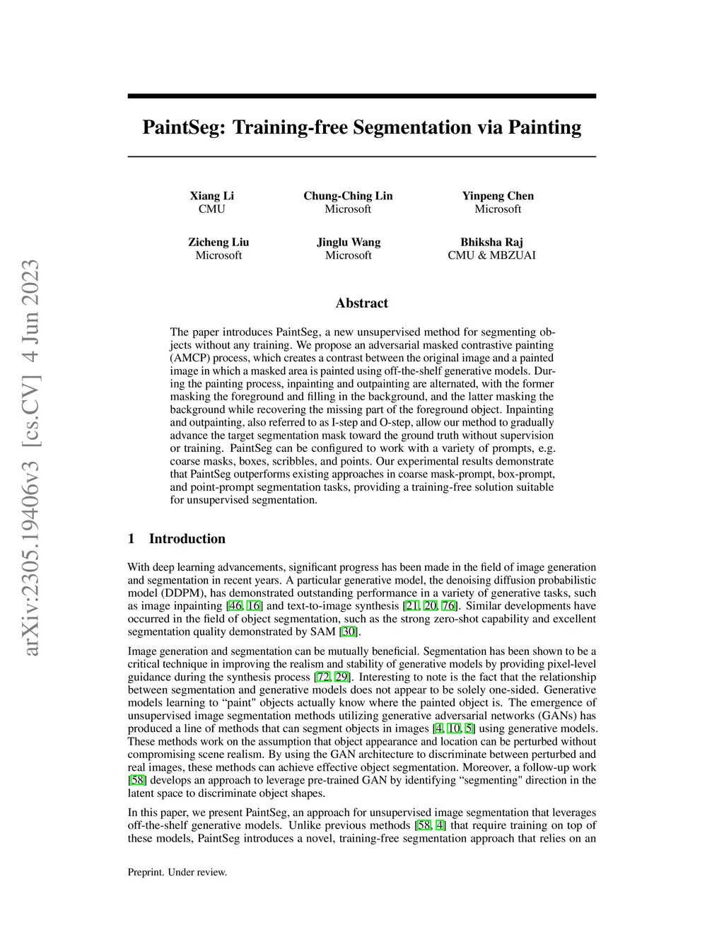 The paper introduces PaintSeg, a new unsupervised method for segmenting objects without any training. We propose an adversarial masked contrastive painting (AMCP) process, which creates a contrast between the original image and a painted image in which a masked area is painted using off-the-shelf generative models. During the painting process, inpainting and outpainting are alternated, with the former masking the foreground and filling in the background, and the latter masking the background while recovering the missing part of the foreground object. Inpainting and outpainting, also referred to as I-step and O-step, allow our method to gradually advance the target segmentation mask toward the ground truth without supervision or training. PaintSeg can be configured to work with a variety of prompts, e.g. coarse masks, boxes, scribbles, and points. Our experimental results demonstrate that PaintSeg outperforms existing approaches in coarse mask-prompt, box-prompt, and point-prompt segmentation tasks, providing a training-free solution suitable for unsupervised segmentation.