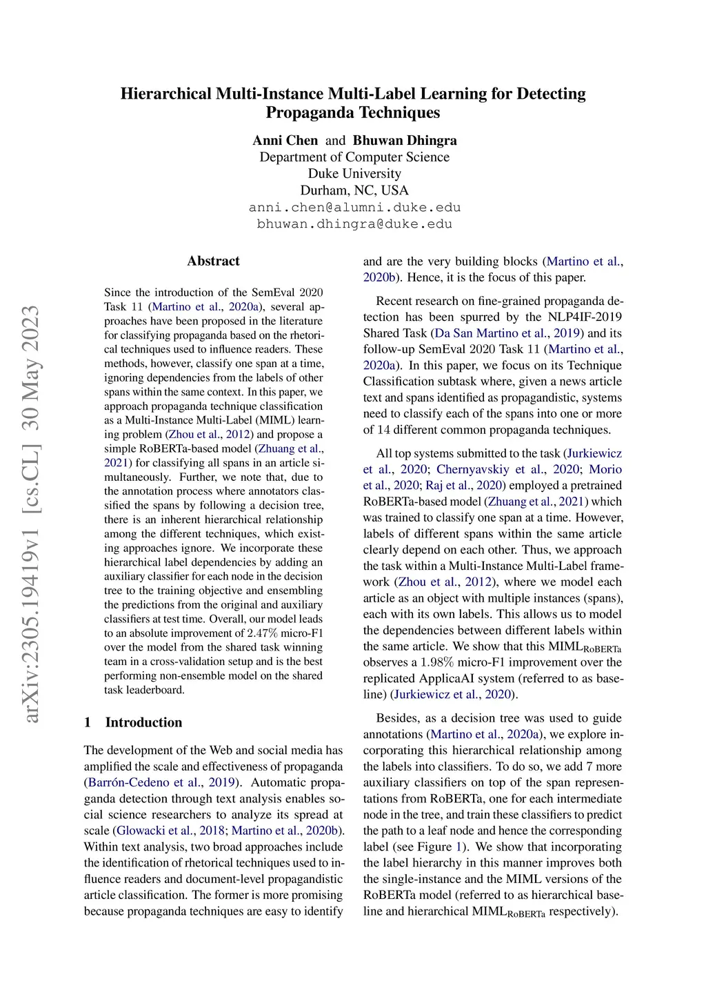 Since the introduction of the SemEval 2020 Task 11 (Martino et al., 2020a), several approaches have been proposed in the literature for classifying propaganda based on the rhetorical techniques used to influence readers. These methods, however, classify one span at a time, ignoring dependencies from the labels of other spans within the same context. In this paper, we approach propaganda technique classification as a Multi-Instance Multi-Label (MIML) learning problem (Zhou et al., 2012) and propose a simple RoBERTa-based model (Zhuang et al., 2021) for classifying all spans in an article simultaneously. Further, we note that, due to the annotation process where annotators classified the spans by following a decision tree, there is an inherent hierarchical relationship among the different techniques, which existing approaches ignore. We incorporate these hierarchical label dependencies by adding an auxiliary classifier for each node in the decision tree to the training objective and ensembling the predictions from the original and auxiliary classifiers at test time. Overall, our model leads to an absolute improvement of 2.47% micro-F1 over the model from the shared task winning team in a cross-validation setup and is the best performing non-ensemble model on the shared task leaderboard.