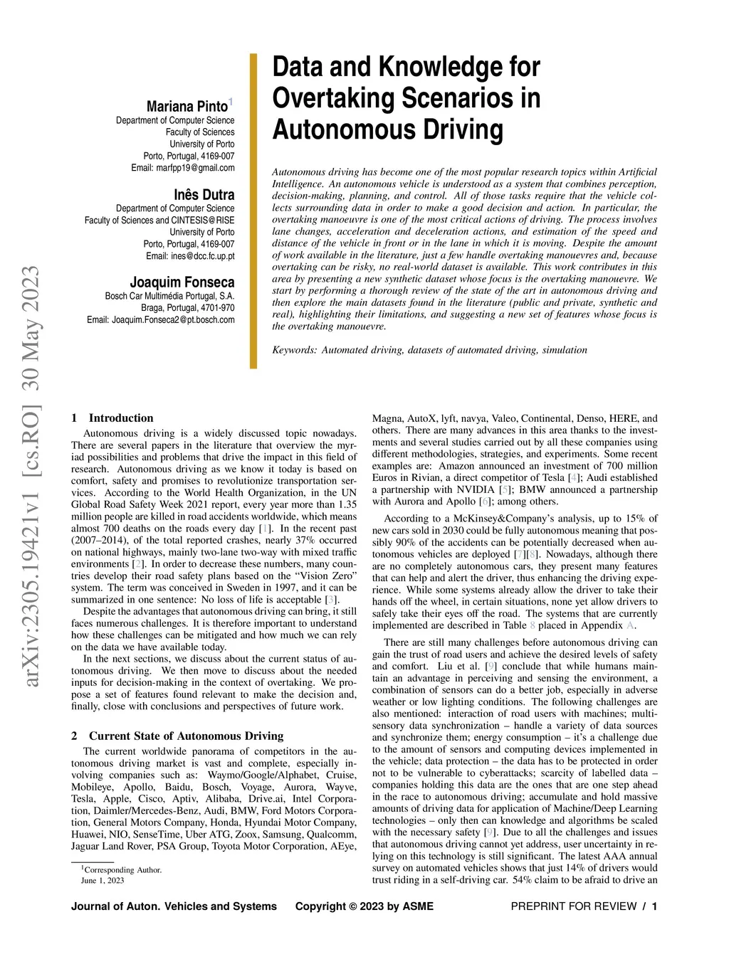 Autonomous driving has become one of the most popular research topics within Artificial Intelligence. An autonomous vehicle is understood as a system that combines perception, decision-making, planning, and control. All of those tasks require that the vehicle collects surrounding data in order to make a good decision and action. In particular, the overtaking maneuver is one of the most critical actions of driving. The process involves lane changes, acceleration and deceleration actions, and estimation of the speed and distance of the vehicle in front or in the lane in which it is moving. Despite the amount of work available in the literature, just a few handle overtaking maneuvers and, because overtaking can be risky, no real-world dataset is available. This work contributes in this area by presenting a new synthetic dataset whose focus is the overtaking maneuver. We start by performing a thorough review of the state of the art in autonomous driving and then explore the main datasets found in the literature (public and private, synthetic and real), highlighting their limitations, and suggesting a new set of features whose focus is the overtaking maneuver.