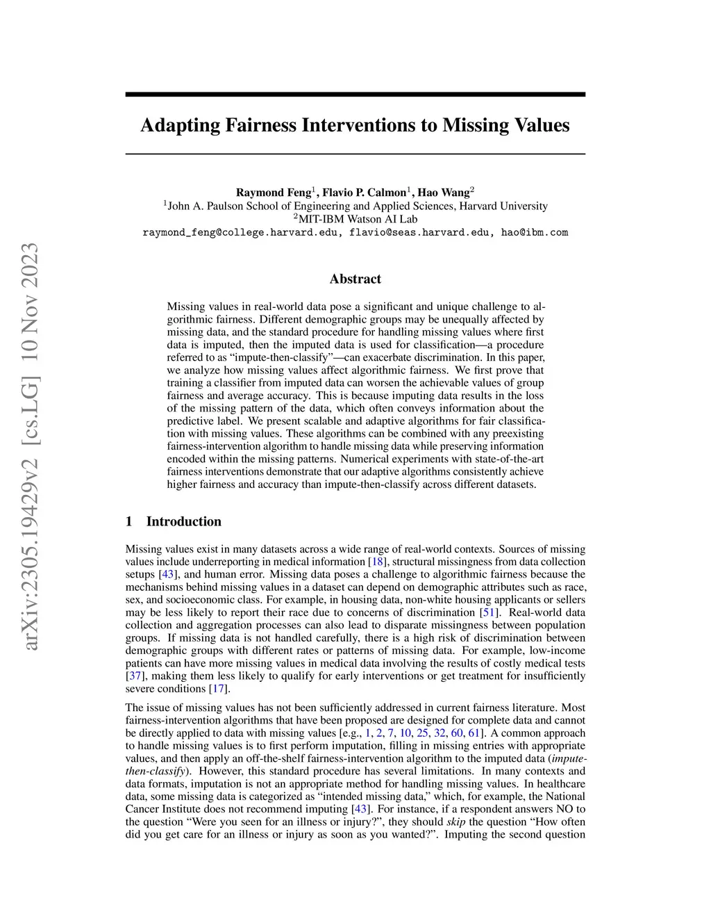 Missing values in real-world data pose a significant and unique challenge to algorithmic fairness. Different demographic groups may be unequally affected by missing data, and the standard procedure for handling missing values where first data is imputed, then the imputed data is used for classification -- a procedure referred to as "impute-then-classify" -- can exacerbate discrimination. In this paper, we analyze how missing values affect algorithmic fairness. We first prove that training a classifier from imputed data can significantly worsen the achievable values of group fairness and average accuracy. This is because imputing data results in the loss of the missing pattern of the data, which often conveys information about the predictive label. We present scalable and adaptive algorithms for fair classification with missing values. These algorithms can be combined with any preexisting fairness-intervention algorithm to handle all possible missing patterns while preserving information encoded within the missing patterns. Numerical experiments with state-of-the-art fairness interventions demonstrate that our adaptive algorithms consistently achieve higher fairness and accuracy than impute-then-classify across different datasets.