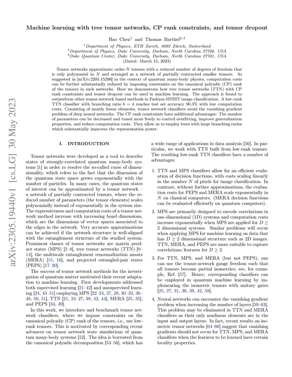 Machine learning with tree tensor networks, CP rank constraints, and tensor dropout