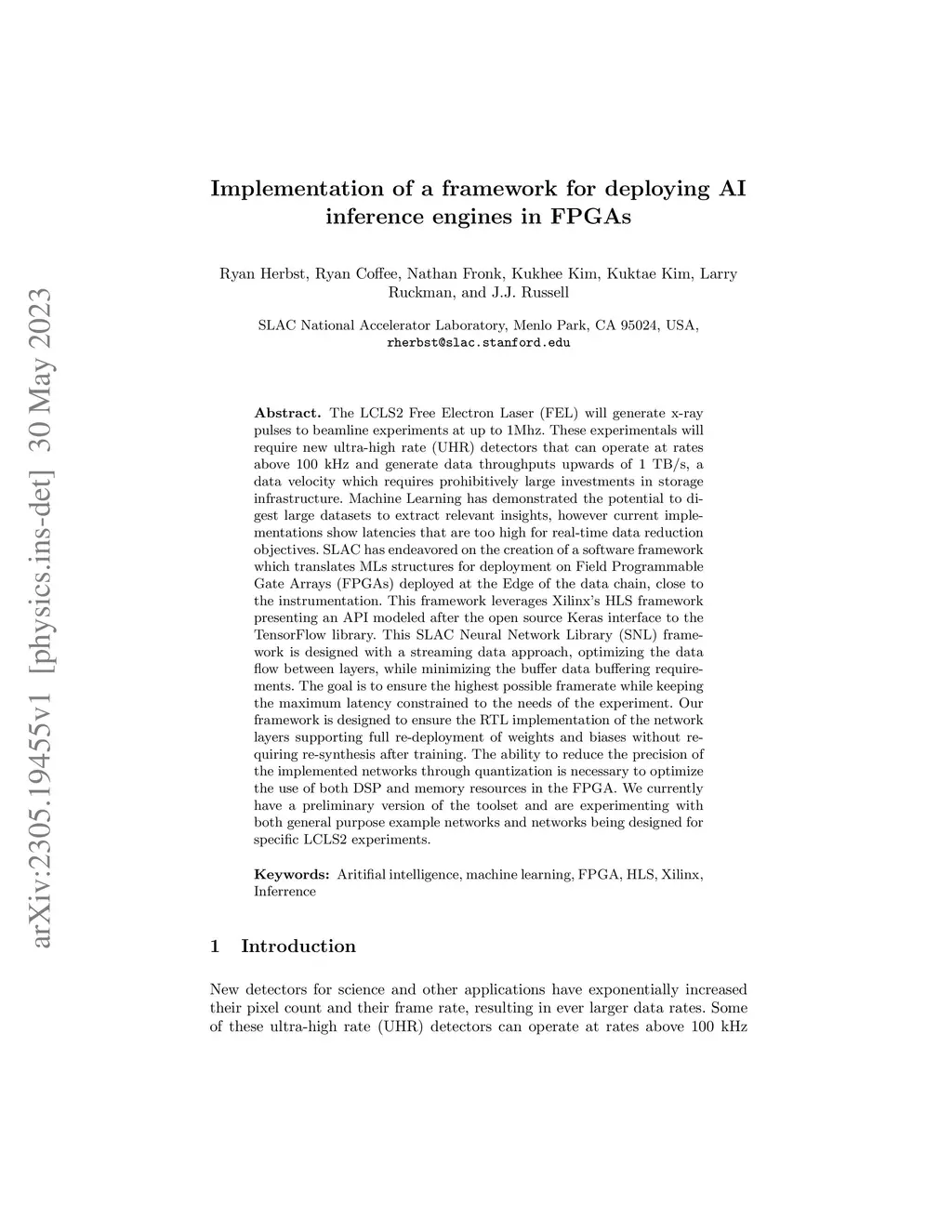 The LCLS2 Free Electron Laser FEL will generate xray pulses to beamline experiments at up to 1Mhz These experimentals will require new ultrahigh rate UHR detectors that can operate at rates above 100 kHz and generate data throughputs upwards of 1 TBs a data velocity which requires prohibitively large investments in storage infrastructure Machine Learning has demonstrated the potential to digest large datasets to extract relevant insights however current implementations show latencies that are too high for realtime data reduction objectives SLAC has endeavored on the creation of a software framework which translates MLs structures for deployment on Field Programmable Gate Arrays FPGAs deployed at the Edge of the data chain close to the instrumentation This framework leverages Xilinxs HLS framework presenting an API modeled after the open source Keras interface to the TensorFlow library This SLAC Neural Network Library SNL framework is designed with a streaming data approach optimizing the data flow between layers while minimizing the buffer data buffering requirements The goal is to ensure the highest possible framerate while keeping the maximum latency constrained to the needs of the experiment Our framework is designed to ensure the RTL implementation of the network layers supporting full redeployment of weights and biases without requiring resynthesis after training The ability to reduce the precision of the implemented networks through quantization is necessary to optimize the use of both DSP and memory resources in the FPGA We currently have a preliminary version of the toolset and are experimenting with both general purpose example networks and networks being designed for specific LCLS2 experiments.