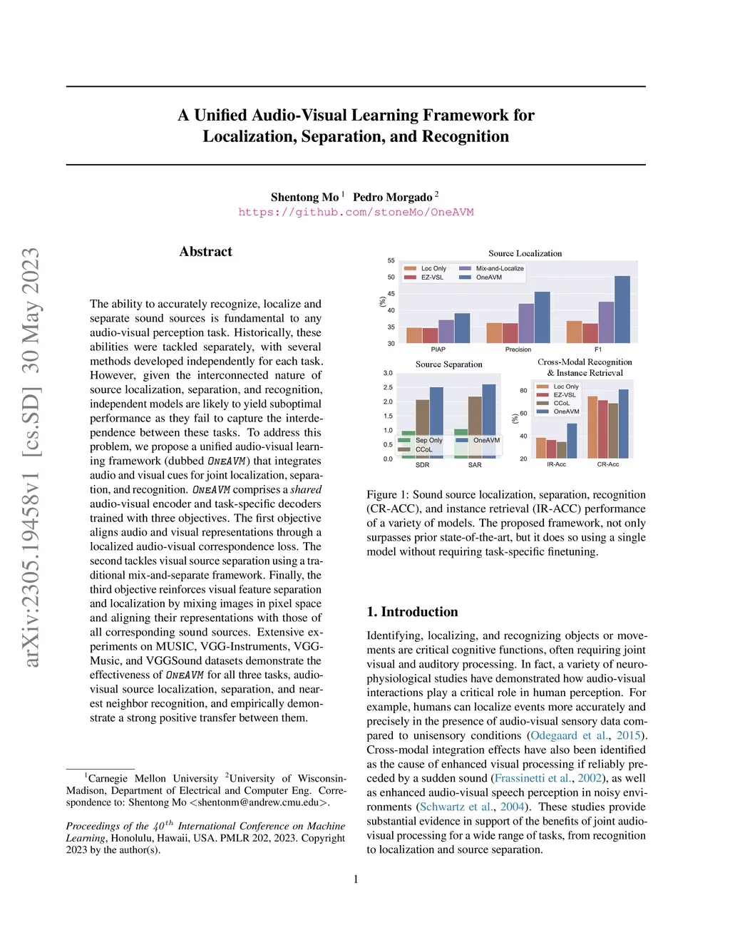 The ability to accurately recognize, localize and separate sound sources is fundamental to any audio-visual perception task. Historically, these abilities were tackled separately, with several methods developed independently for each task. However, given the interconnected nature of source localization, separation, and recognition, independent models are likely to yield suboptimal performance as they fail to capture the interdependence between these tasks. To address this problem, we propose a unified audio-visual learning framework (dubbed OneAVM) that integrates audio and visual cues for joint localization, separation, and recognition. OneAVM comprises a shared audio-visual encoder and task-specific decoders trained with three objectives. The first objective aligns audio and visual representations through a localized audio-visual correspondence loss. The second tackles visual source separation using a traditional mix-and-separate framework. Finally, the third objective reinforces visual feature separation and localization by mixing images in pixel space and aligning their representations with those of all corresponding sound sources. Extensive experiments on MUSIC, VGG-Instruments, VGG-Music, and VGGSound datasets demonstrate the effectiveness of OneAVM for all three tasks, audio-visual source localization, separation, and nearest neighbor recognition, and empirically demonstrate a strong positive transfer between them.