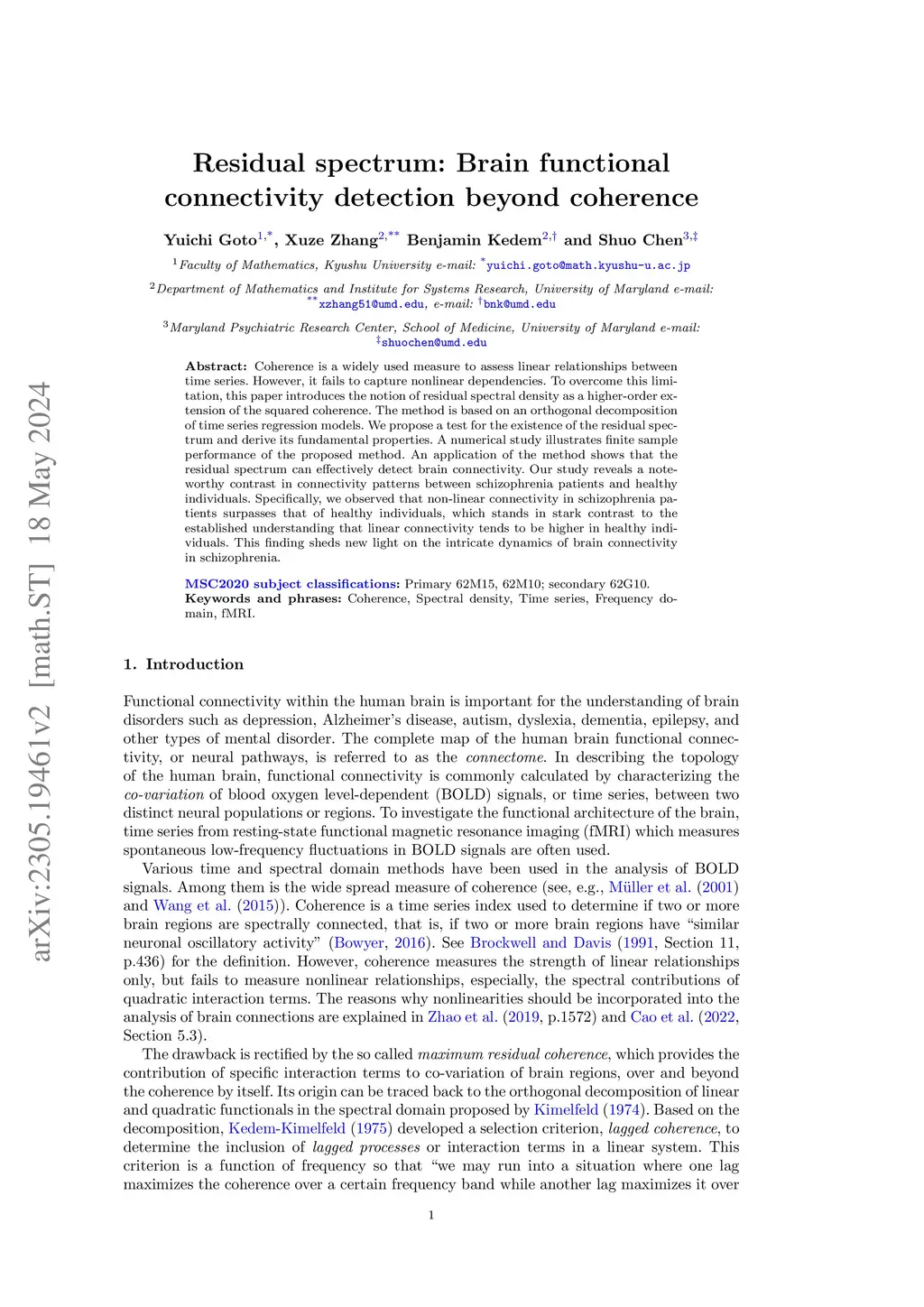 Coherence is a widely used measure to assess linear relationships between time series. However, it fails to capture nonlinear dependencies. To overcome this limitation, this paper introduces the notion of residual spectral density as a higher-order extension of the squared coherence. The method is based on an orthogonal decomposition of time series regression models. We propose a test for the existence of the residual spectrum and derive its fundamental properties. A numerical study illustrates finite sample performance of the proposed method. An application of the method shows that the residual spectrum can effectively detect brain connectivity. Our study reveals a noteworthy contrast in connectivity patterns between schizophrenia patients and healthy individuals. Specifically, we observed that non-linear connectivity in schizophrenia patients surpasses that of healthy individuals, which stands in stark contrast to the established understanding that linear connectivity tends to be higher in healthy individuals. This finding sheds new light on the intricate dynamics of brain connectivity in schizophrenia.