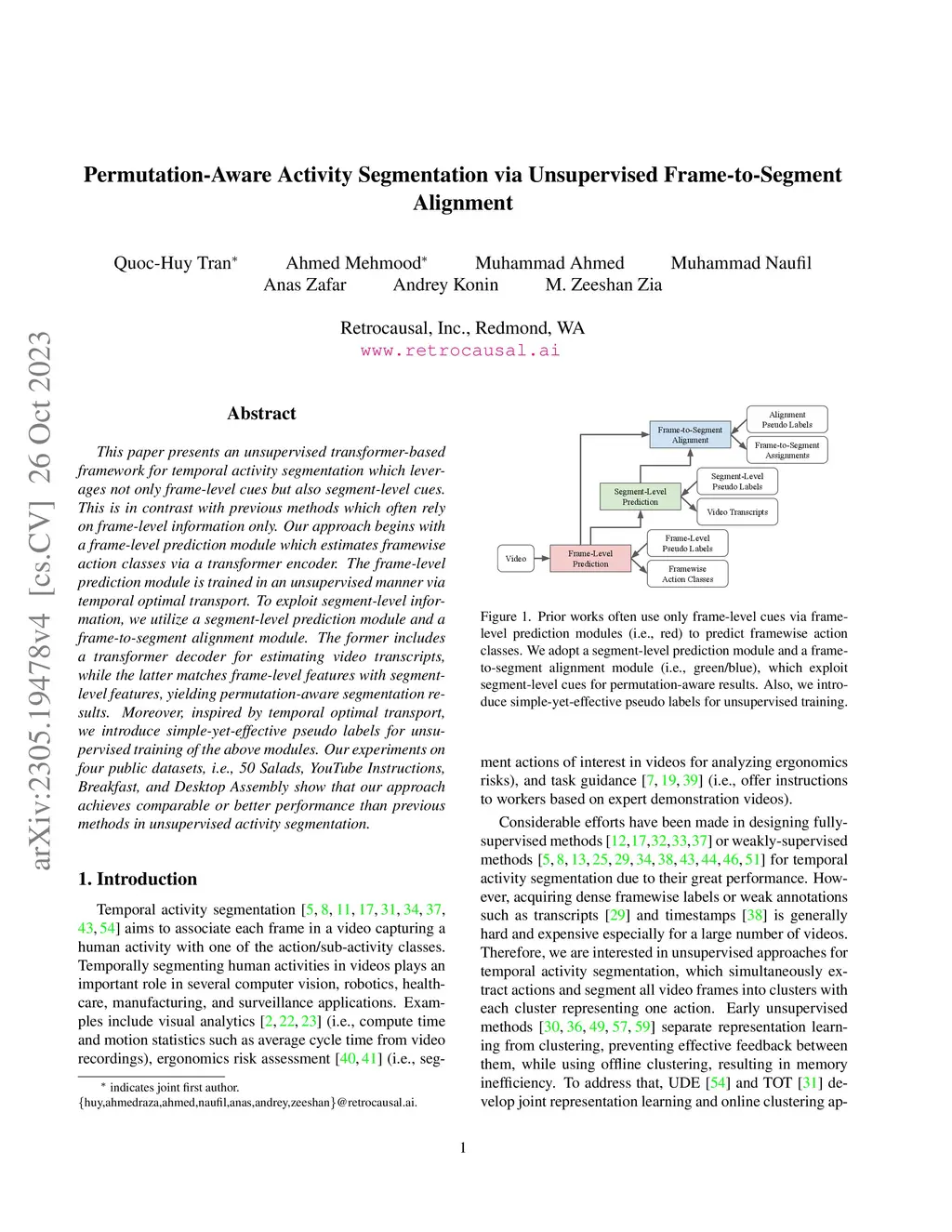 This paper presents an unsupervised transformer-based framework for temporal activity segmentation which leverages not only frame-level cues but also segment-level cues. This is in contrast with previous methods which often rely on frame-level information only. Our approach begins with a frame-level prediction module which estimates framewise action classes via a transformer encoder. The frame-level prediction module is trained in an unsupervised manner via temporal optimal transport. To exploit segment-level information, we utilize a segment-level prediction module and a frame-to-segment alignment module. The former includes a transformer decoder for estimating video transcripts, while the latter matches frame-level features with segment-level features, yielding permutation-aware segmentation results. Moreover, inspired by temporal optimal transport, we introduce simple-yet-effective pseudo labels for unsupervised training of the above modules. Our experiments on four public datasets, i.e., 50 Salads, YouTube Instructions, Breakfast, and Desktop Assembly show that our approach achieves comparable or better performance than previous methods in unsupervised activity segmentation. Our code and dataset are available on our research website:this https URL.