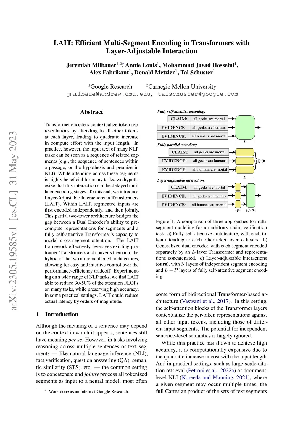 Transformer encoders contextualize token representations by attending to all other tokens at each layer, leading to quadratic increase in compute effort with the input length. In practice, however, the input text of many NLP tasks can be seen as a sequence of related segments (e.g., the sequence of sentences within a passage, or the hypothesis and premise in NLI). While attending across these segments is highly beneficial for many tasks, we hypothesize that this interaction can be delayed until later encoding stages. To this end, we introduce Layer-Adjustable Interactions in Transformers (LAIT). Within LAIT, segmented inputs are first encoded independently, and then jointly. This partial two-tower architecture bridges the gap between a Dual Encoder's ability to pre-compute representations for segments and a fully self-attentive Transformer's capacity to model cross-segment attention. The LAIT framework effectively leverages existing pretrained Transformers and converts them into the hybrid of the two aforementioned architectures, allowing for easy and intuitive control over the performance-efficiency tradeoff. Experimenting on a wide range of NLP tasks, we find LAIT able to reduce 30-50% of the attention FLOPs on many tasks, while preserving high accuracy; in some practical settings, LAIT could reduce actual latency by orders of magnitude.