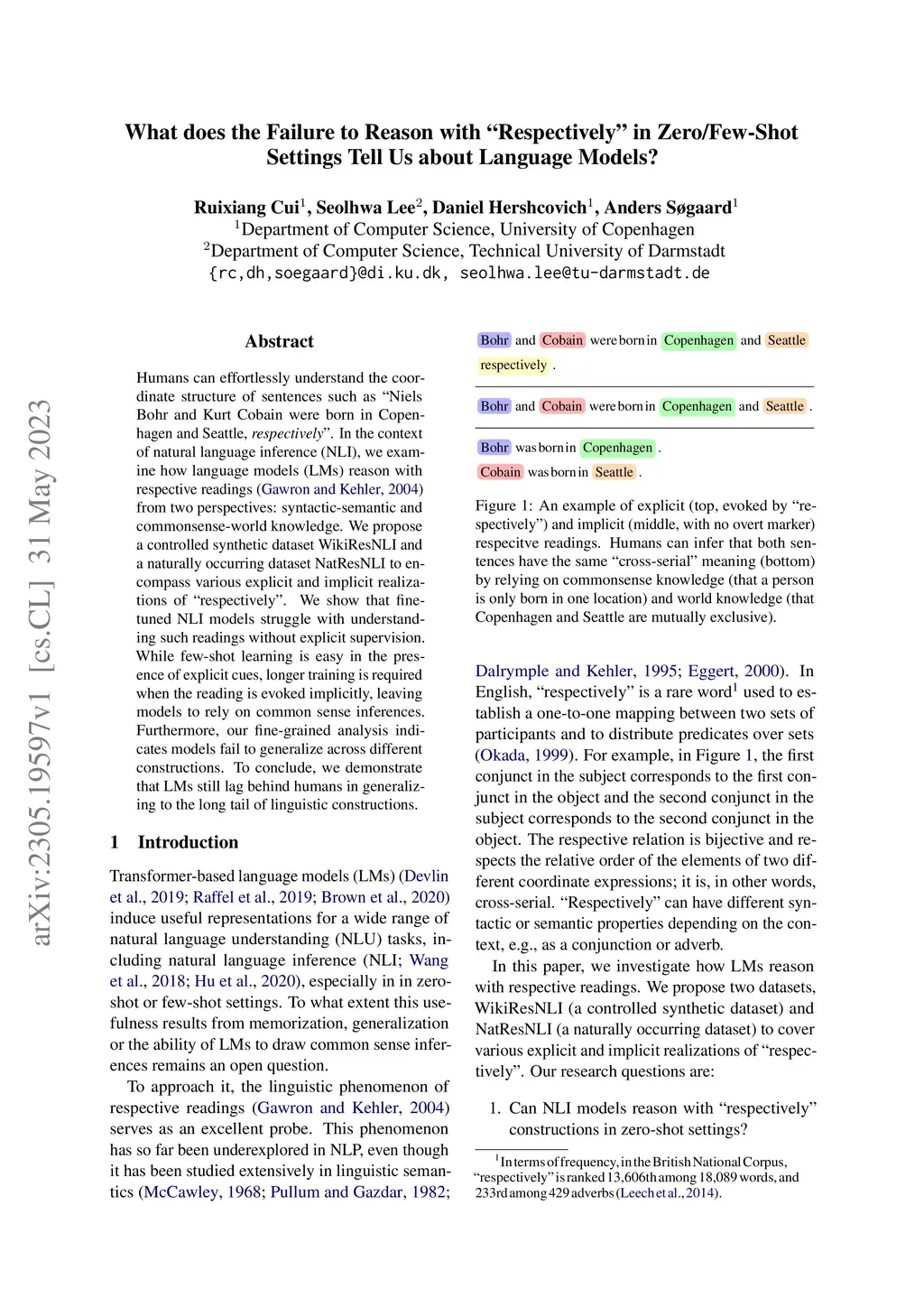 Humans can effortlessly understand the coordinate structure of sentences such as "Niels Bohr and Kurt Cobain were born in Copenhagen and Seattle, respectively". In the context of natural language inference (NLI), we examine how language models (LMs) reason with respective readings (Gawron and Kehler, 2004) from two perspectives: syntactic-semantic and commonsense-world knowledge. We propose a controlled synthetic dataset WikiResNLI and a naturally occurring dataset NatResNLI to encompass various explicit and implicit realizations of "respectively". We show that fine-tuned NLI models struggle with understanding such readings without explicit supervision. While few-shot learning is easy in the presence of explicit cues, longer training is required when the reading is evoked implicitly, leaving models to rely on common sense inferences. Furthermore, our fine-grained analysis indicates models fail to generalize across different constructions. To conclude, we demonstrate that LMs still lag behind humans in generalizing to the long tail of linguistic constructions.