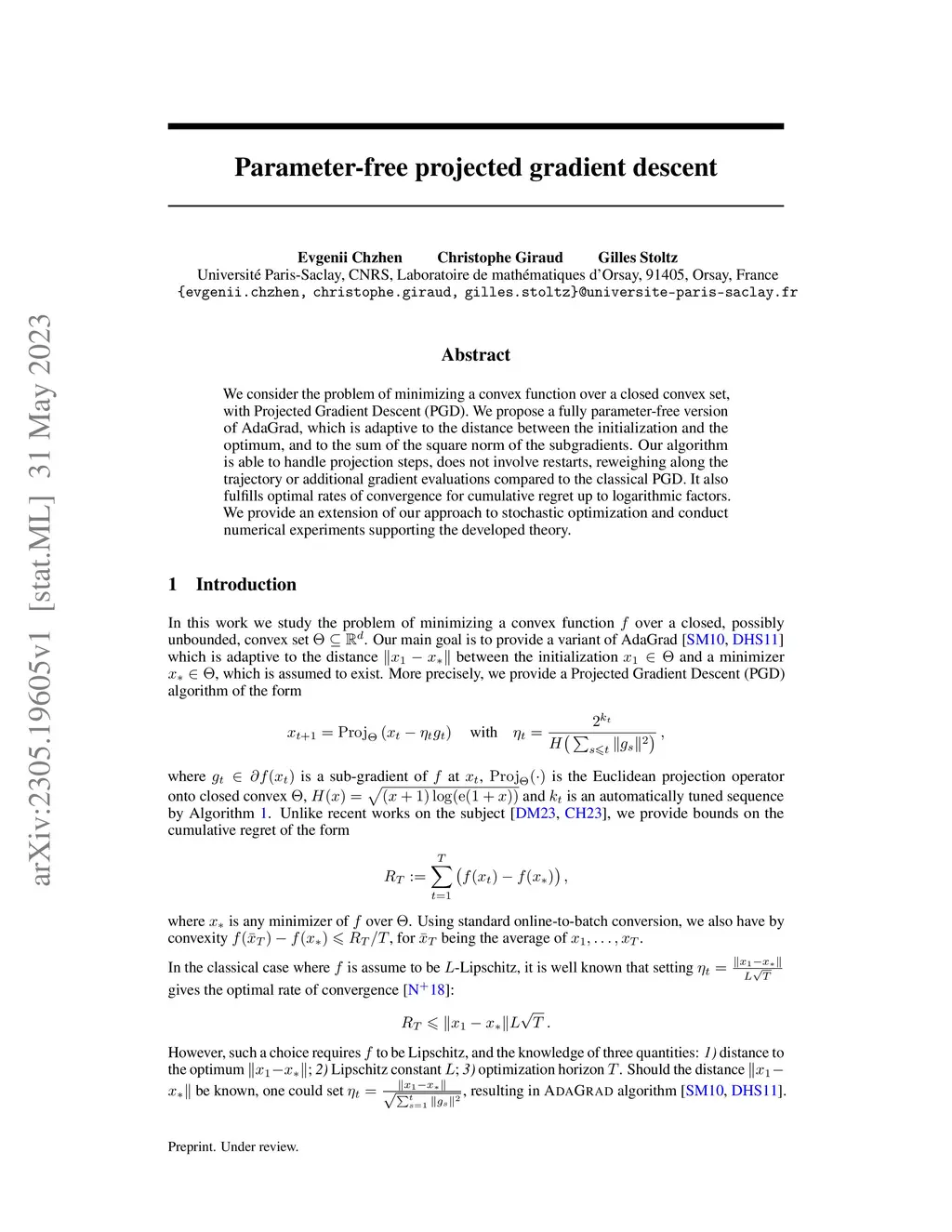 We consider the problem of minimizing a convex function over a closed convex set, with Projected Gradient Descent (PGD). We propose a fully parameter-free version of AdaGrad, which is adaptive to the distance between the initialization and the optimum, and to the sum of the square norm of the subgradients. Our algorithm is able to handle projection steps, does not involve restarts, reweighing along the trajectory or additional gradient evaluations compared to the classical PGD. It also fulfills optimal rates of convergence for cumulative regret up to logarithmic factors. We provide an extension of our approach to stochastic optimization and conduct numerical experiments supporting the developed theory.