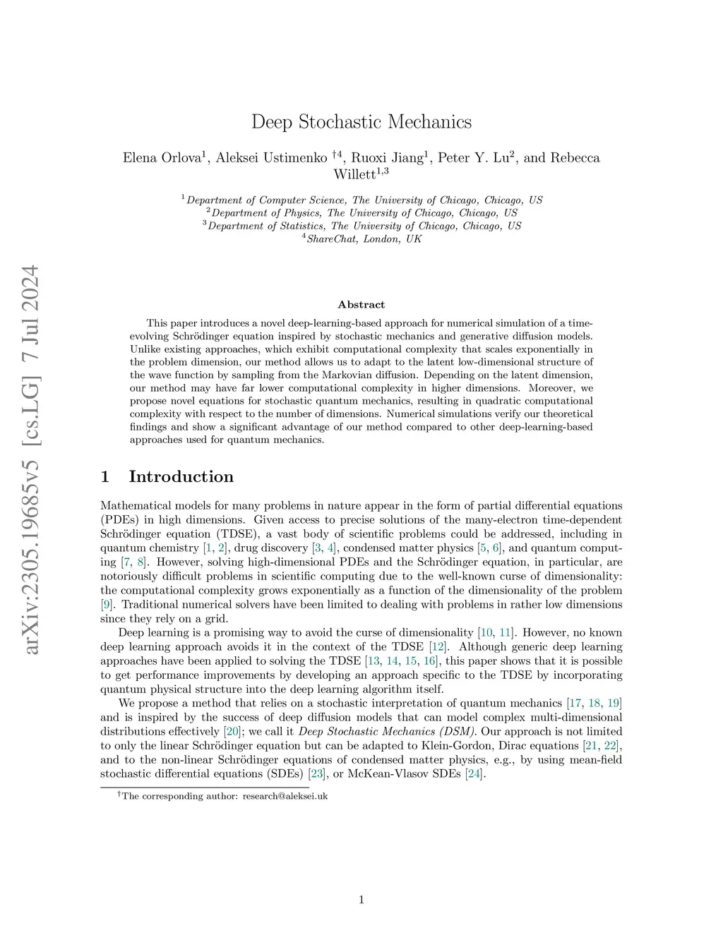 This paper introduces a novel deep-learning-based approach for numerical simulation of a time-evolving Schr\"odinger equation inspired by stochastic mechanics and generative diffusion models. Unlike existing approaches, which exhibit computational complexity that scales exponentially in the problem dimension, our method allows us to adapt to the latent low-dimensional structure of the wave function by sampling from the Markovian diffusion. Depending on the latent dimension, our method may have far lower computational complexity in higher dimensions. Moreover, we propose novel equations for stochastic quantum mechanics, resulting in quadratic computational complexity with respect to the number of dimensions. Numerical simulations verify our theoretical findings and show a significant advantage of our method compared to other deep-learning-based approaches used for quantum mechanics.