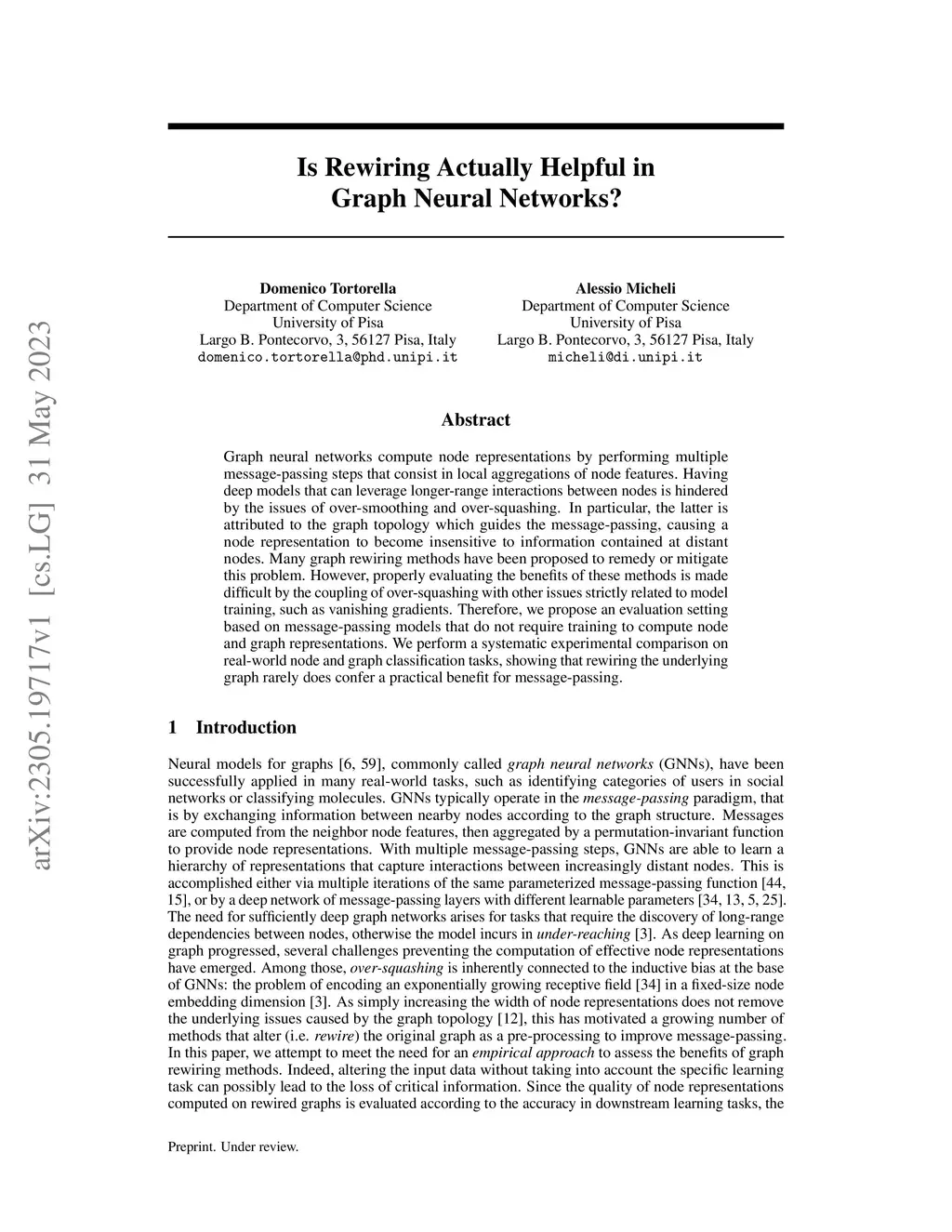 Graph neural networks compute node representations by performing multiple message-passing steps that consist in local aggregations of node features. Having deep models that can leverage longer-range interactions between nodes is hindered by the issues of over-smoothing and over-squashing. In particular, the latter is attributed to the graph topology which guides the message-passing, causing a node representation to become insensitive to information contained at distant nodes. Many graph rewiring methods have been proposed to remedy or mitigate this problem. However, properly evaluating the benefits of these methods is made difficult by the coupling of over-squashing with other issues strictly related to model training, such as vanishing gradients. Therefore, we propose an evaluation setting based on message-passing models that do not require training to compute node and graph representations. We perform a systematic experimental comparison on real-world node and graph classification tasks, showing that rewiring the underlying graph rarely does confer a practical benefit for message-passing.