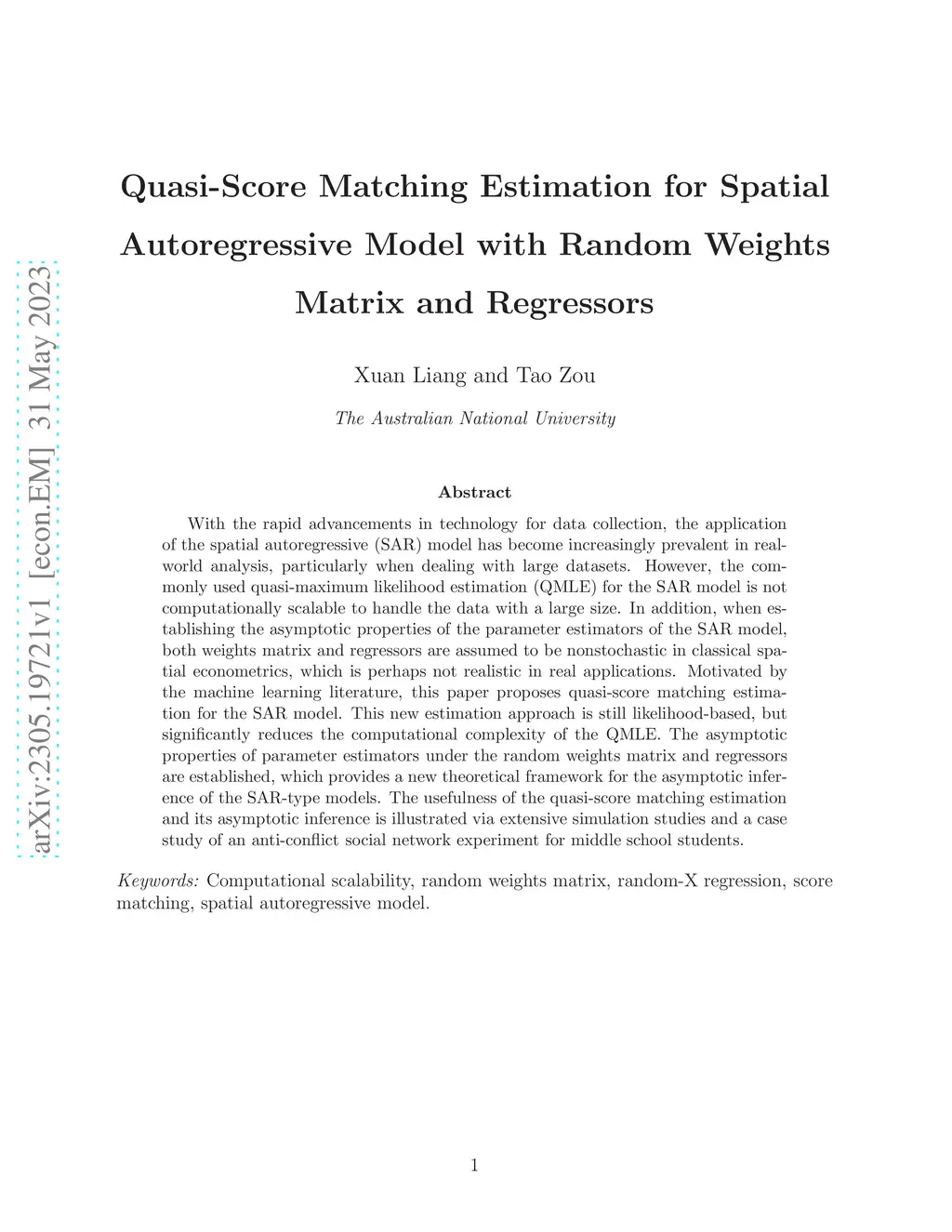 With the rapid advancements in technology for data collection, the application of the spatial autoregressive (SAR) model has become increasingly prevalent in real-world analysis, particularly when dealing with large datasets. However, the commonly used quasi-maximum likelihood estimation (QMLE) for the SAR model is not computationally scalable to handle the data with a large size. In addition, when establishing the asymptotic properties of the parameter estimators of the SAR model, both weights matrix and regressors are assumed to be nonstochastic in classical spatial econometrics, which is perhaps not realistic in real applications. Motivated by the machine learning literature, this paper proposes quasi-score matching estimation for the SAR model. This new estimation approach is still likelihood-based, but significantly reduces the computational complexity of the QMLE. The asymptotic properties of parameter estimators under the random weights matrix and regressors are established, which provides a new theoretical framework for the asymptotic inference of the SAR-type models. The usefulness of the quasi-score matching estimation and its asymptotic inference is illustrated via extensive simulation studies and a case study of an anti-conflict social network experiment for middle school students.