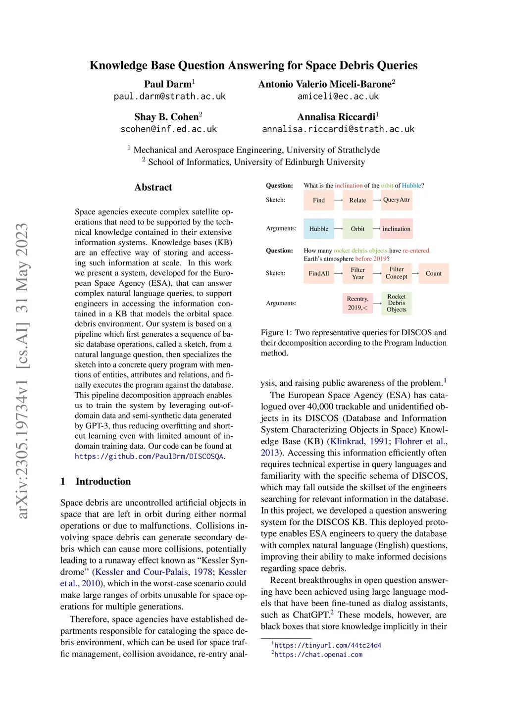 Space agencies execute complex satellite operations that need to be supported by the technical knowledge contained in their extensive information systems. Knowledge bases (KB) are an effective way of storing and accessing such information at scale. In this work we present a system, developed for the European Space Agency (ESA), that can answer complex natural language queries, to support engineers in accessing the information contained in a KB that models the orbital space debris environment. Our system is based on a pipeline which first generates a sequence of basic database operations, called a %program sketch, from a natural language question, then specializes the sketch into a concrete query program with mentions of entities, attributes and relations, and finally executes the program against the database. This pipeline decomposition approach enables us to train the system by leveraging out-of-domain data and semi-synthetic data generated by GPT-3, thus reducing overfitting and shortcut learning even with limited amount of in-domain training data. Our code can be found at \url{https://github.com/PaulDrm/DISCOSQA}.