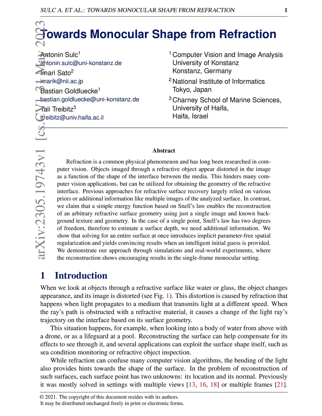 Refraction is a common physical phenomenon and has long been researched in computer vision. Objects imaged through a refractive object appear distorted in the image as a function of the shape of the interface between the media. This hinders many computer vision applications, but can be utilized for obtaining the geometry of the refractive interface. Previous approaches for refractive surface recovery largely relied on various priors or additional information like multiple images of the analyzed surface. In contrast, we claim that a simple energy function based on Snell's law enables the reconstruction of an arbitrary refractive surface geometry using just a single image and known background texture and geometry. In the case of a single point, Snell's law has two degrees of freedom, therefore to estimate a surface depth, we need additional information. We show that solving for an entire surface at once introduces implicit parameter-free spatial regularization and yields convincing results when an intelligent initial guess is provided. We demonstrate our approach through simulations and real-world experiments, where the reconstruction shows encouraging results in the single-frame monocular setting.