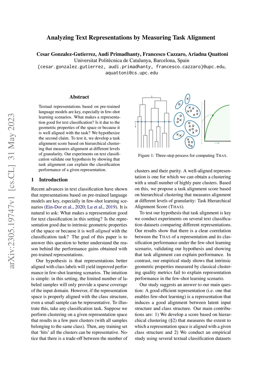 Textual representations based on pre-trained language models are key, especially in few-shot learning scenarios. What makes a representation good for text classification? Is it due to the geometric properties of the space or because it is well aligned with the task? We hypothesize the second claim. To test it, we develop a task alignment score based on hierarchical clustering that measures alignment at different levels of granularity. Our experiments on text classification validate our hypothesis by showing that task alignment can explain the classification performance of a given representation.