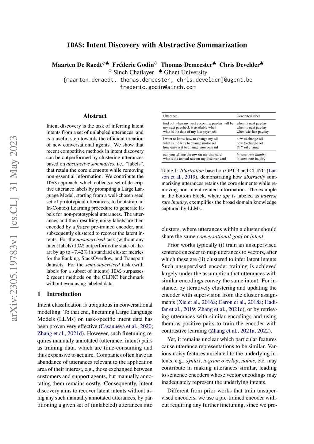 Intent discovery is the task of inferring latent intents from a set of unlabeled utterances, and is a useful step towards the efficient creation of new conversational agents. We show that recent competitive methods in intent discovery can be outperformed by clustering utterances based on abstractive summaries, i.e., "labels", that retain the core elements while removing non-essential information. We contribute the IDAS approach, which collects a set of descriptive utterance labels by prompting a Large Language Model, starting from a well-chosen seed set of prototypical utterances, to bootstrap an In-Context Learning procedure to generate labels for non-prototypical utterances. The utterances and their resulting noisy labels are then encoded by a frozen pre-trained encoder, and subsequently clustered to recover the latent intents. For the unsupervised task (without any intent labels) IDAS outperforms the state-of-the-art by up to +7.42% in standard cluster metrics for the Banking, StackOverflow, and Transport datasets. For the semi-supervised task (with labels for a subset of intents) IDAS surpasses 2 recent methods on the CLINC benchmark without even using labeled data.