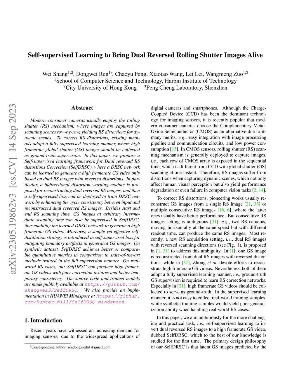 Self-supervised Learning to Bring Dual Reversed Rolling Shutter Images