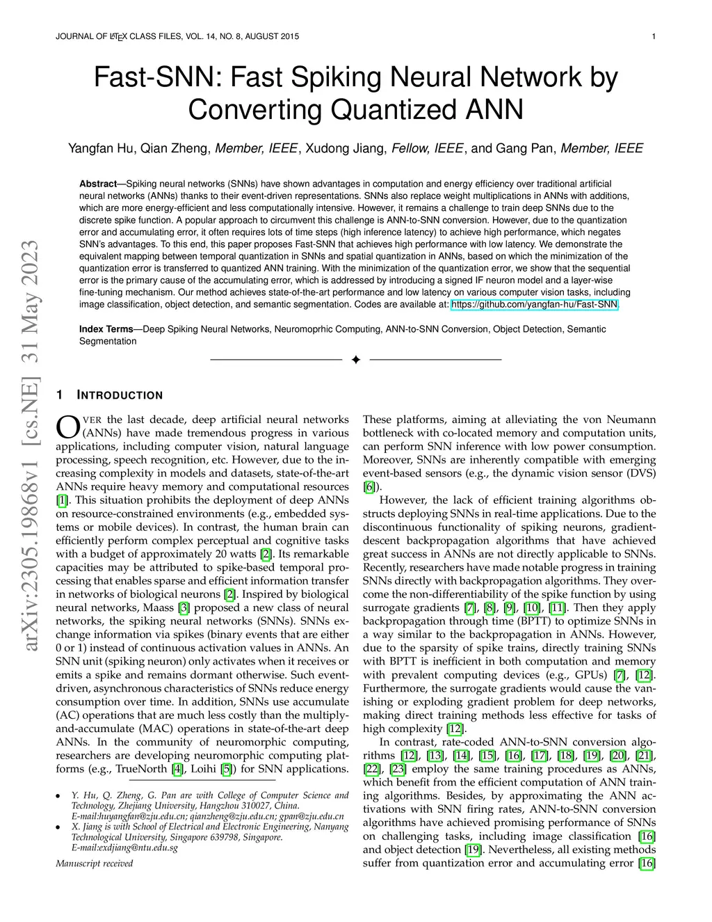 Spiking neural networks (SNNs) have shown advantages in computation and energy efficiency over traditional artificial neural networks (ANNs) thanks to their event-driven representations. SNNs also replace weight multiplications in ANNs with additions, which are more energy-efficient and less computationally intensive. However, it remains a challenge to train deep SNNs due to the discrete spike function. A popular approach to circumvent this challenge is ANN-to-SNN conversion. However, due to the quantization error and accumulating error, it often requires lots of time steps (high inference latency) to achieve high performance, which negates SNN's advantages. To this end, this paper proposes Fast-SNN that achieves high performance with low latency. We demonstrate the equivalent mapping between temporal quantization in SNNs and spatial quantization in ANNs, based on which the minimization of the quantization error is transferred to quantized ANN training. With the minimization of the quantization error, we show that the sequential error is the primary cause of the accumulating error, which is addressed by introducing a signed IF neuron model and a layer-wise fine-tuning mechanism. Our method achieves state-of-the-art performance and low latency on various computer vision tasks, including image classification, object detection, and semantic segmentation. Codes are available at: https://github.com/yangfan-hu/Fast-SNN.