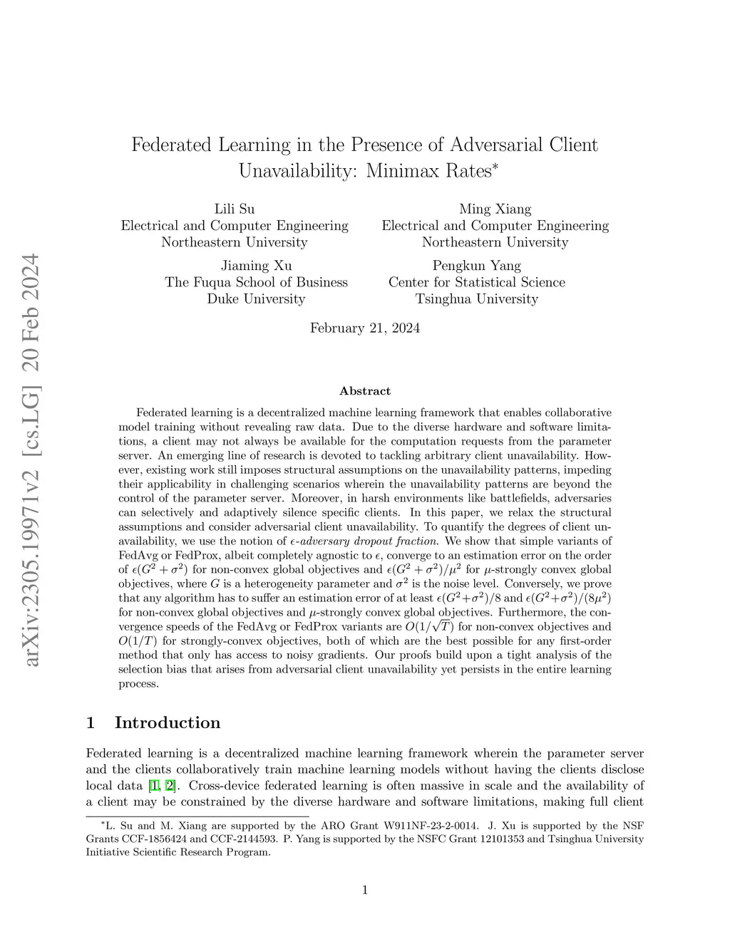 Federated learning is a decentralized machine learning framework wherein not all clients are able to participate in each round. An emerging line of research is devoted to tackling arbitrary client unavailability. Existing theoretical analysis imposes restrictive structural assumptions on the unavailability patterns, and their proposed algorithms were tailored to those assumptions. In this paper, we relax those assumptions and consider adversarial client unavailability. To quantify the degrees of client unavailability, we use the notion of {\em -adversary dropout fraction}. For both non-convex and strongly-convex global objectives, we show that simple variants of FedAvg or FedProx, albeit completely agnostic to , converge to an estimation error on the order of , where is a heterogeneity parameter and is the noise level. We prove that this estimation error is minimax-optimal. We also show that the variants of FedAvg or FedProx have convergence speeds for non-convex objectives and for strongly-convex objectives, both of which are the best possible for any first-order method that only has access to noisy gradients. Our proofs build upon a tight analysis of the selection bias that persists in the entire learning process. We validate our theoretical prediction through numerical experiments on synthetic and real-world datasets.