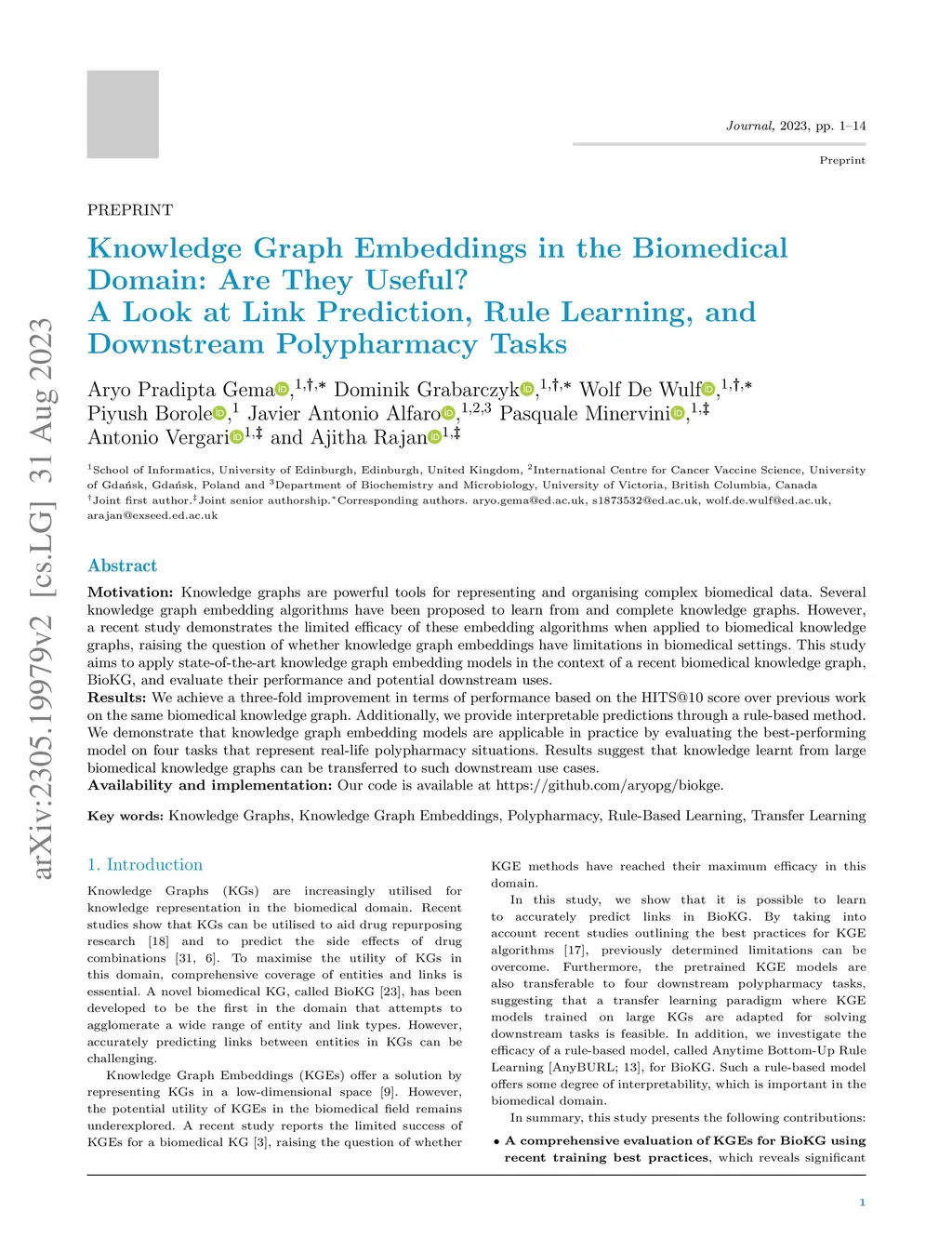 Knowledge graphs are powerful tools for representing and organising complex biomedical data. Several knowledge graph embedding algorithms have been proposed to learn from and complete knowledge graphs. However, a recent study demonstrates the limited efficacy of these embedding algorithms when applied to biomedical knowledge graphs, raising the question of whether knowledge graph embeddings have limitations in biomedical settings. This study aims to apply state-of-the-art knowledge graph embedding models in the context of a recent biomedical knowledge graph, BioKG, and evaluate their performance and potential downstream uses. We achieve a three-fold improvement in terms of performance based on the HITS@10 score over previous work on the same biomedical knowledge graph. Additionally, we provide interpretable predictions through a rule-based method. We demonstrate that knowledge graph embedding models are applicable in practice by evaluating the best-performing model on four tasks that represent real-life polypharmacy situations. Results suggest that knowledge learnt from large biomedical knowledge graphs can be transferred to such downstream use cases. Our code is available at https://github.com/aryopg/biokge.