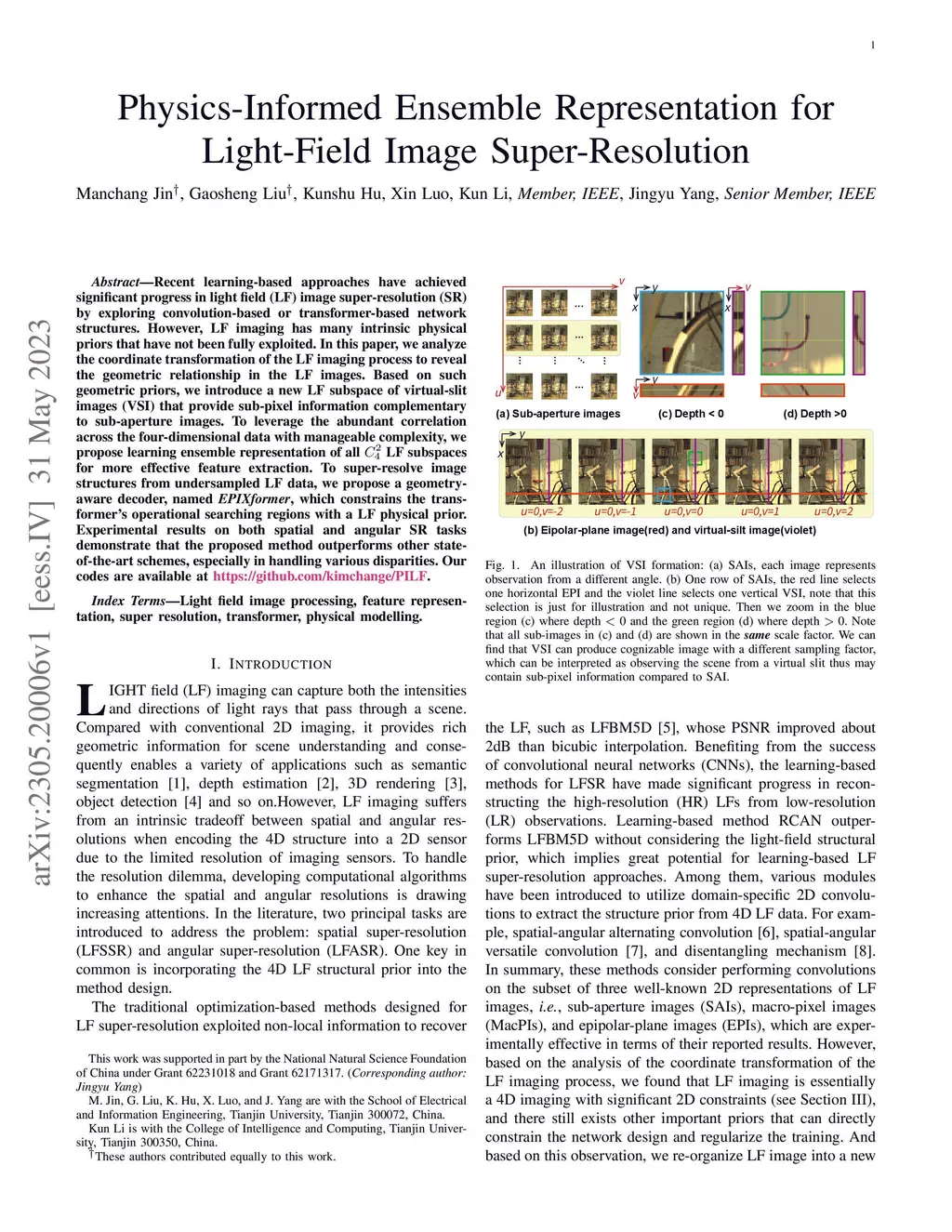 Recent learning-based approaches have achieved significant progress in light field (LF) image super-resolution (SR) by exploring convolution-based or transformer-based network structures. However, LF imaging has many intrinsic physical priors that have not been fully exploited. In this paper, we analyze the coordinate transformation of the LF imaging process to reveal the geometric relationship in the LF images. Based on such geometric priors, we introduce a new LF subspace of virtual-slit images (VSI) that provide sub-pixel information complementary to sub-aperture images. To leverage the abundant correlation across the four-dimensional data with manageable complexity, we propose learning ensemble representation of all LF subspaces for more effective feature extraction. To super-resolve image structures from undersampled LF data, we propose a geometry-aware decoder, named EPIXformer, which constrains the transformer's operational searching regions with a LF physical prior. Experimental results on both spatial and angular SR tasks demonstrate that the proposed method outperforms other state-of-the-art schemes, especially in handling various disparities.