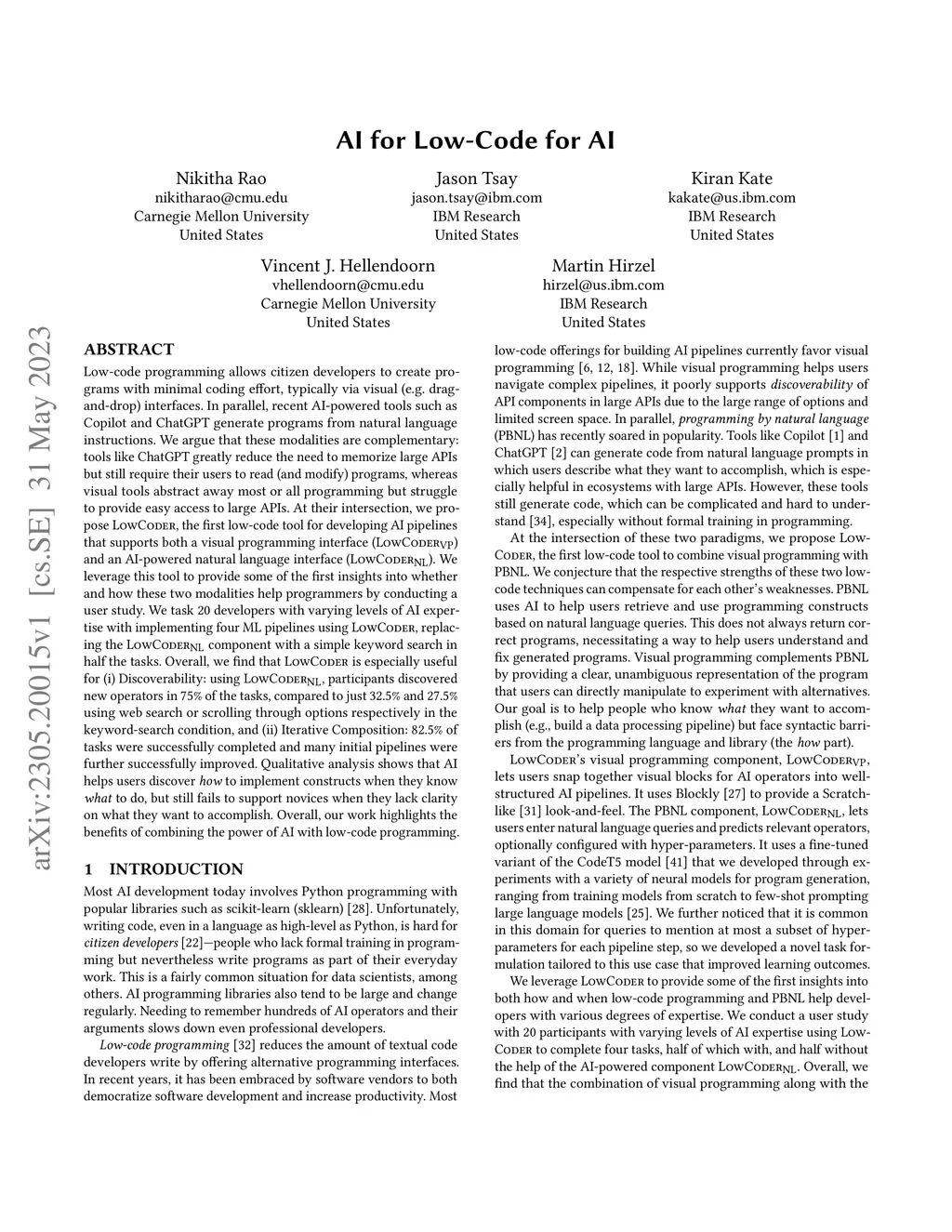 Low-code programming allows citizen developers to create programs with minimal coding effort, typically via visual (e.g. drag-and-drop) interfaces. In parallel, recent AI-powered tools such as Copilot and ChatGPT generate programs from natural language instructions. We argue that these modalities are complementary: tools like ChatGPT greatly reduce the need to memorize large APIs but still require their users to read (and modify) programs, whereas visual tools abstract away most or all programming but struggle to provide easy access to large APIs. At their intersection, we propose LowCoder, the first low-code tool for developing AI pipelines that supports both a visual programming interface (LowCoder_VP) and an AI-powered natural language interface (LowCoder_NL). We leverage this tool to provide some of the first insights into whether and how these two modalities help programmers by conducting a user study. We task 20 developers with varying levels of AI expertise with implementing four ML pipelines using LowCoder, replacing the LowCoder_NL component with a simple keyword search in half the tasks. Overall, we find that LowCoder is especially useful for (i) Discoverability: using LowCoder_NL, participants discovered new operators in 75% of the tasks, compared to just 32.5% and 27.5% using web search or scrolling through options respectively in the keyword-search condition, and (ii) Iterative Composition: 82.5% of tasks were successfully completed and many initial pipelines were further successfully improved. Qualitative analysis shows that AI helps users discover how to implement constructs when they know what to do, but still fails to support novices when they lack clarity on what they want to accomplish. Overall, our work highlights the benefits of combining the power of AI with low-code programming.
